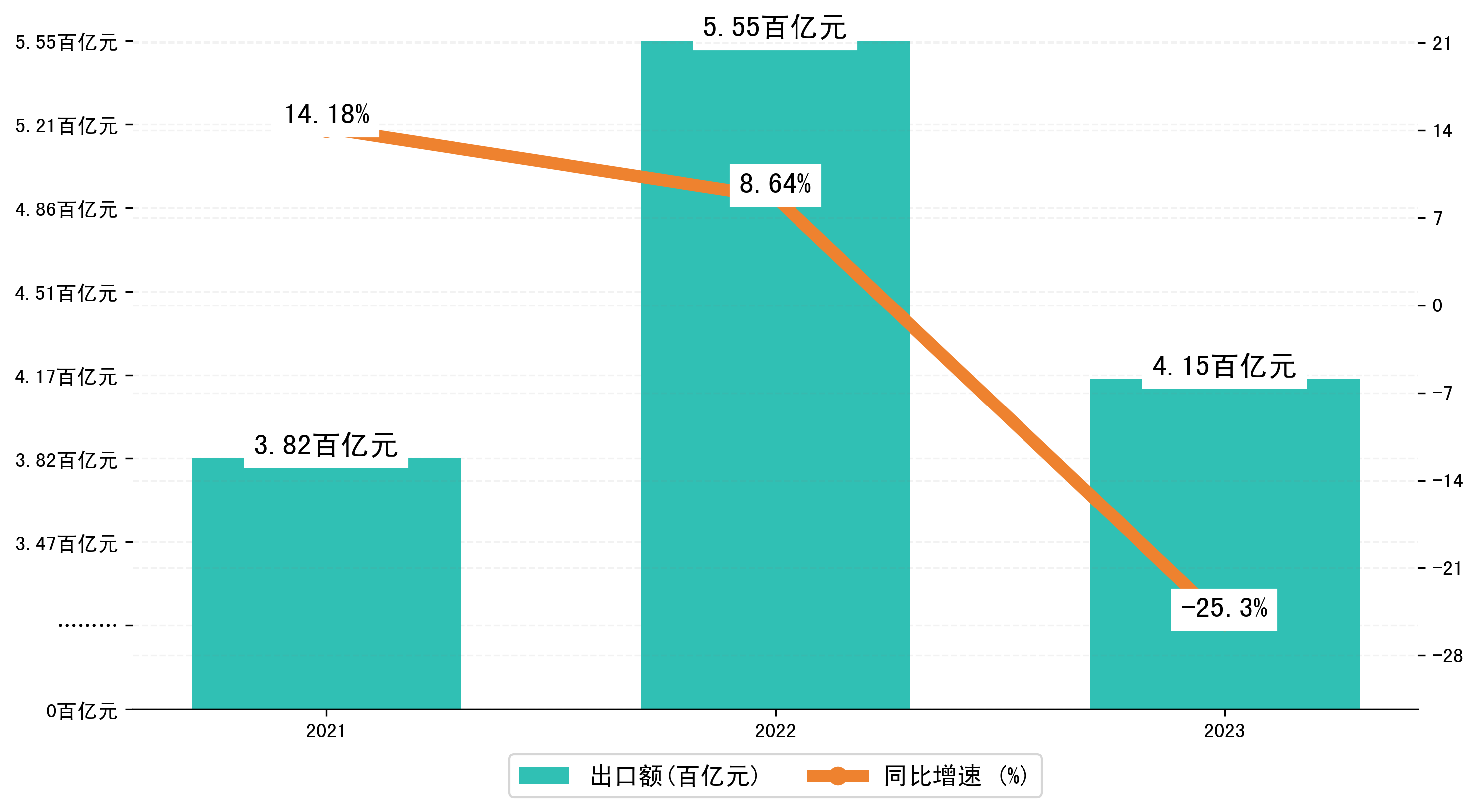 以人民币计,2023年1-11月吉安市出口额为414,8402.1488万元,相比上年同期减少了140,4697.7927万元,同比减少了-20.70%。