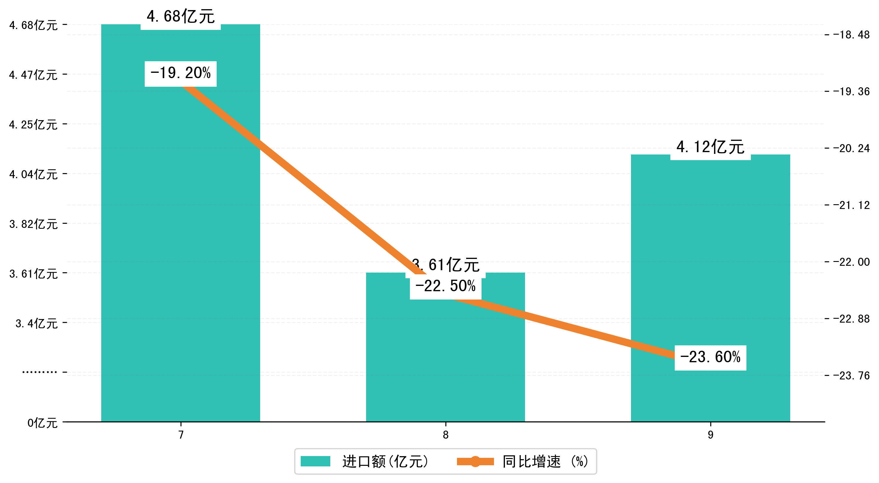 以美元计,2025年1-9月吉安市进口额为5,4490.4386万美元,相比上年同期减少了1,7751.9019万美元,同比减少-24.30%。