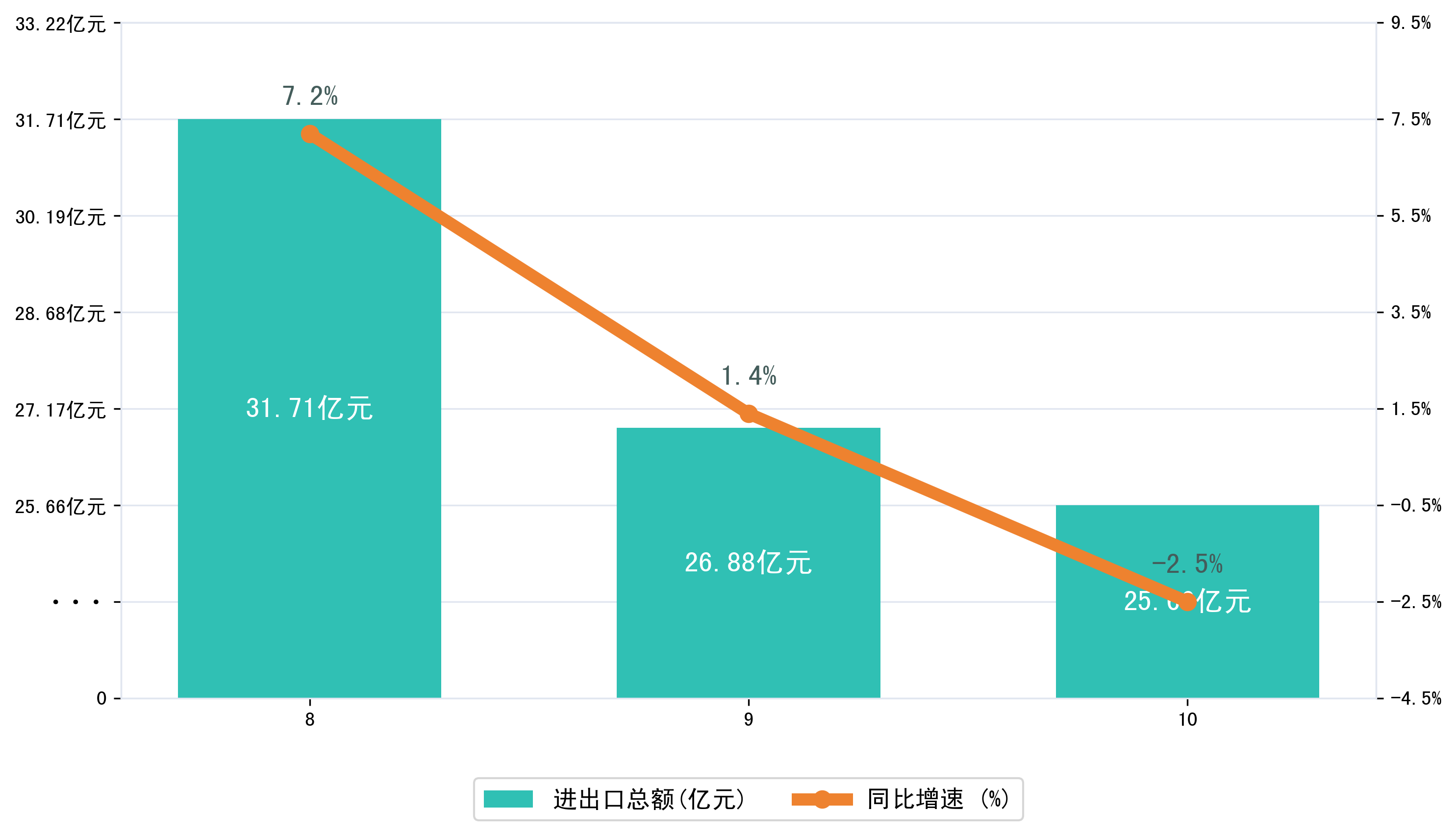 以人民币计,2025年10月吉安市进出口总额为25,6578.5828万元,相比上月减少了1,2176.6898万元;相比上年同期减少了10,4735.6794万元,同比减少了-2.50%。