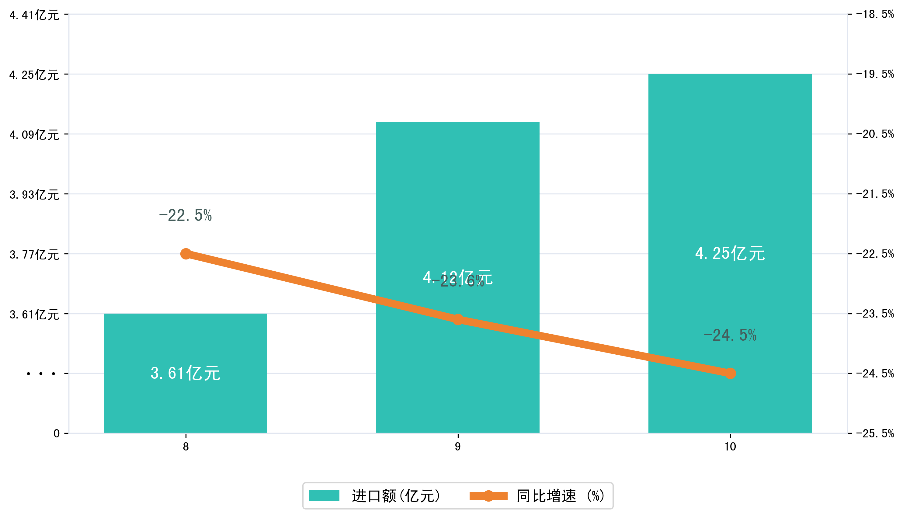 以人民币计,2025年10月吉安市进口额为4,2472.8694万元,相比上月增加了1269.3196万元;相比上年同期减少了2,0044.4675万元,同比减少了-24.50%。