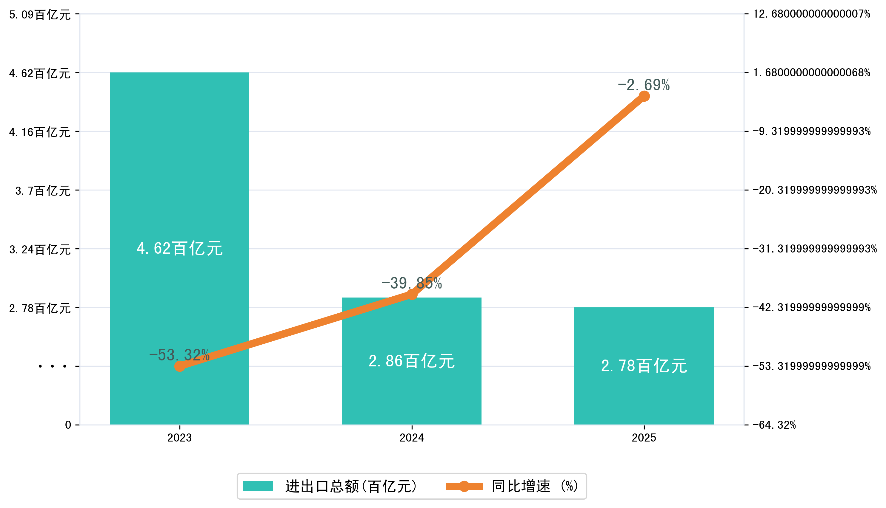 以人民币计,2025年1-10月吉安市进出口总额为278,1568.9596万元,相比上年同期减少了7,6834.1617万元,同比减少了-2.50%。