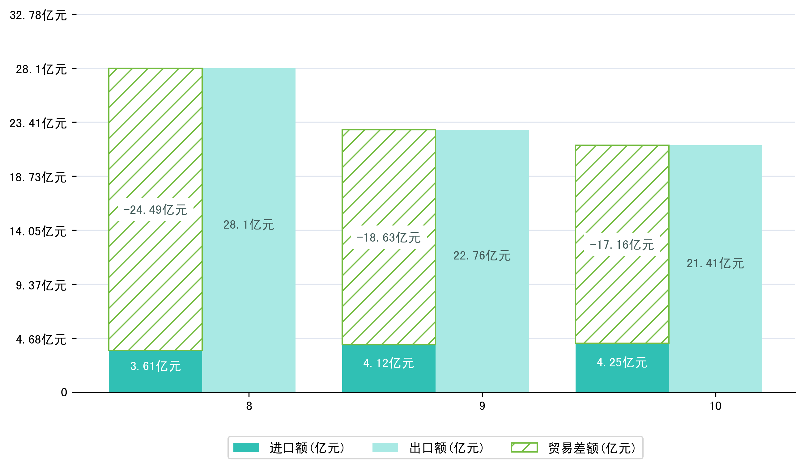 以人民币计,2025年10月吉安市贸易差额为17,1632,8440万元(贸易顺差),相比上月减少了1,4715,3290万元,即1961,2712万美元;相比上年同期减少了6,4646,7444万元,同比减少-27.36%。