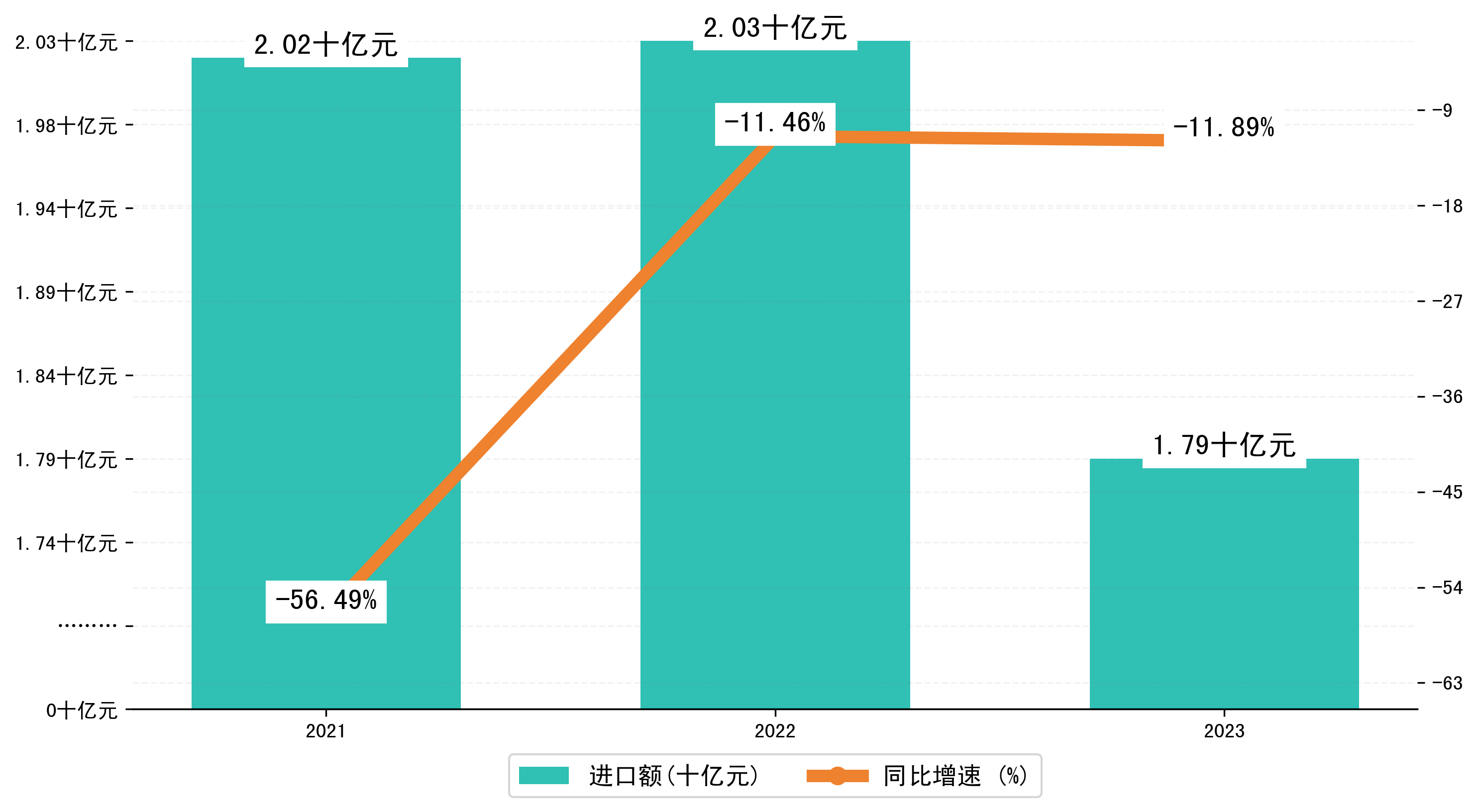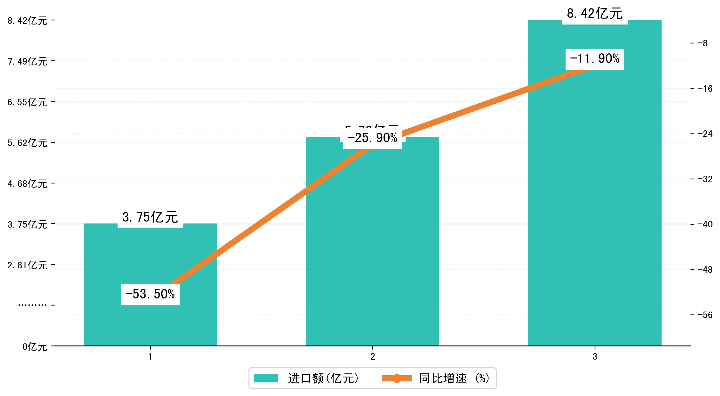 以美元计,2023年1-3月吉安市进口额为2,6149.9824万美元,相比上年同期减少了5780.2221万美元,同比减少-18.10%。