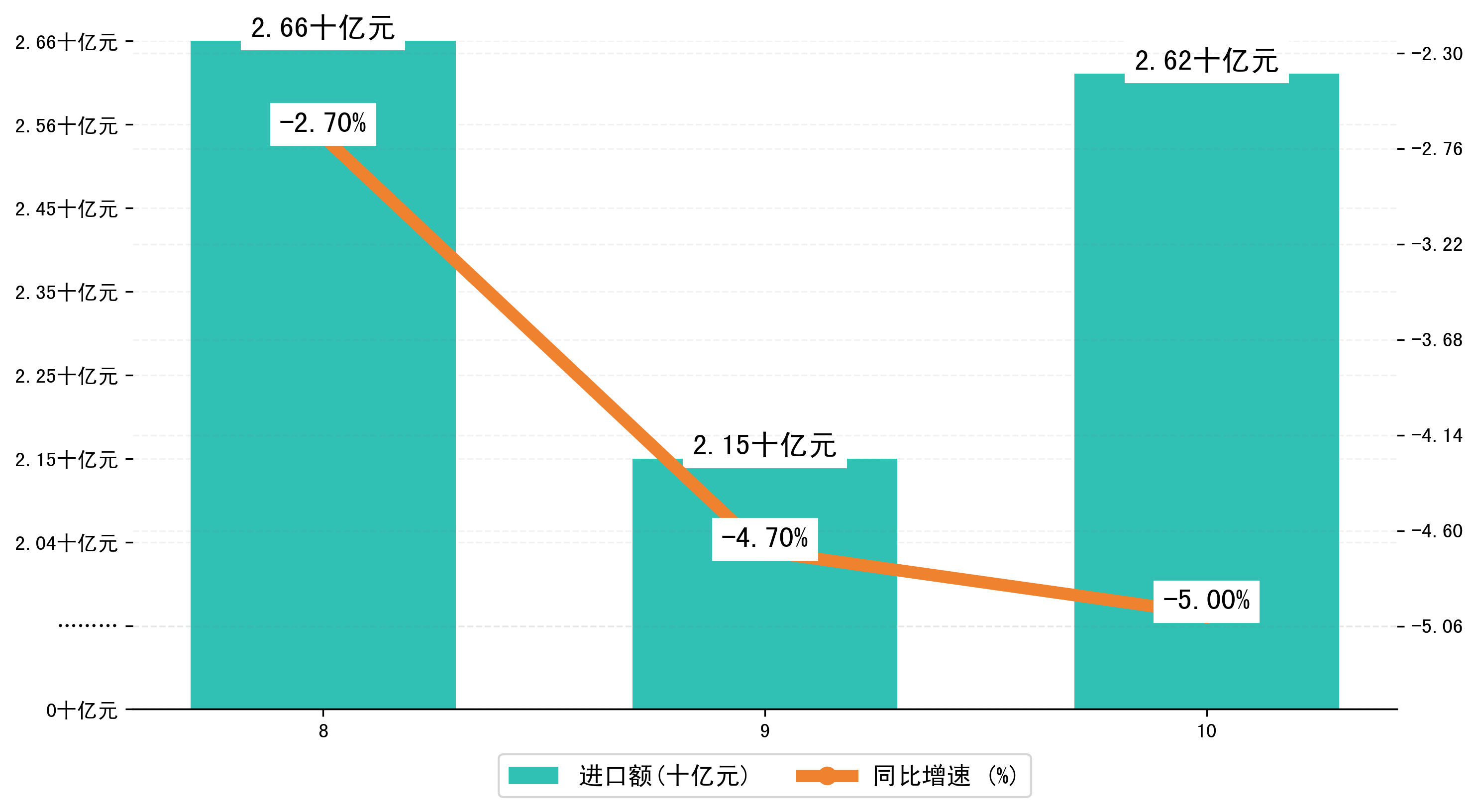 以人民币计,2024年10月江门市进口额为26,1703.1591万元,相比上月增加了4,7039.7824万元;相比上年同期减少了2,2683.4076万元,同比减少了-5.00%。