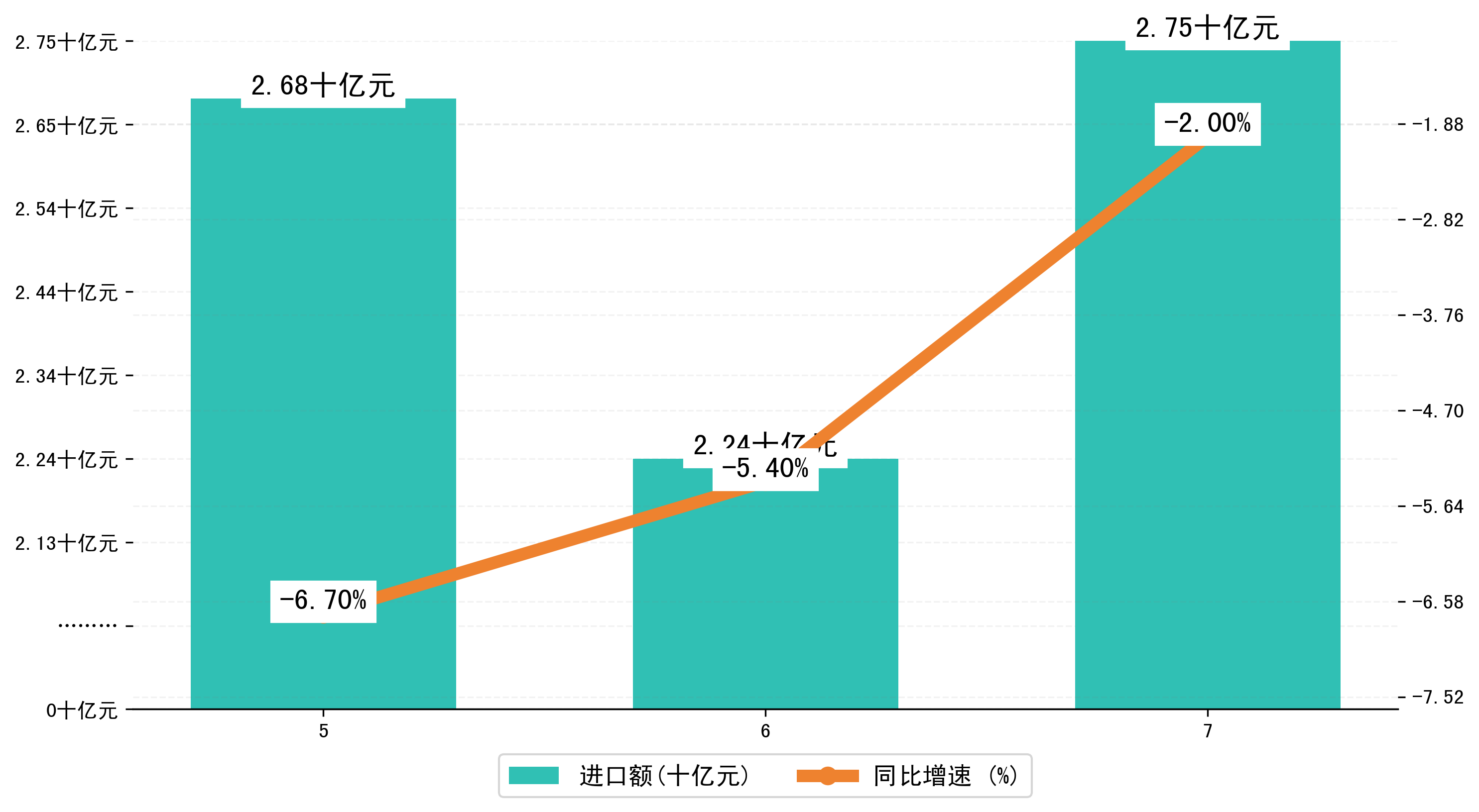 以人民币计,2024年1-7月江门市进口额为175,7929.733万元,相比上年同期减少了3,6938.558万元,同比减少了-2.00%。