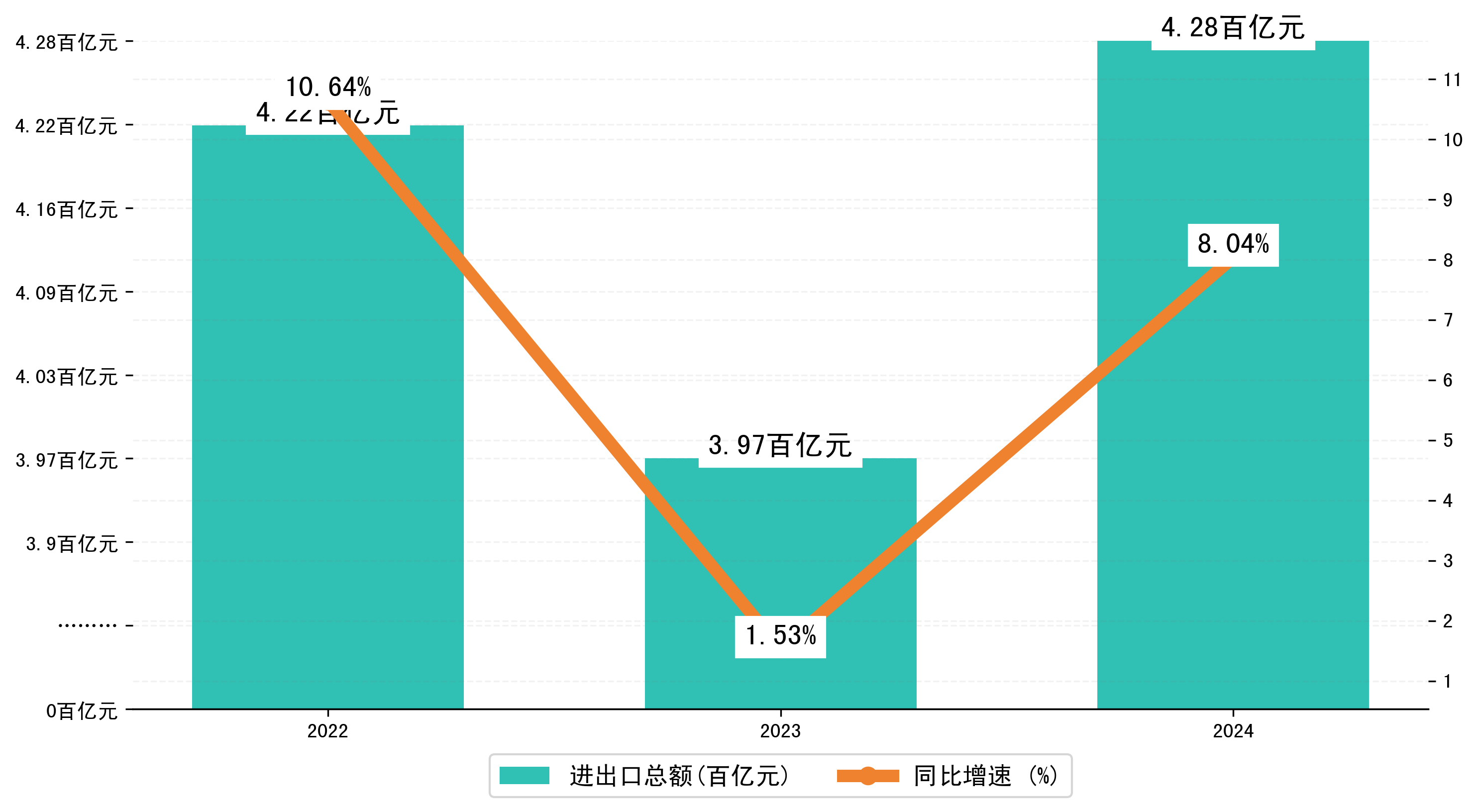以人民币计,2024年1-3月江门市进出口总额为428,4230.1024万元,相比上年同期增加了31,8984.3356万元,同比增加了8.10%。