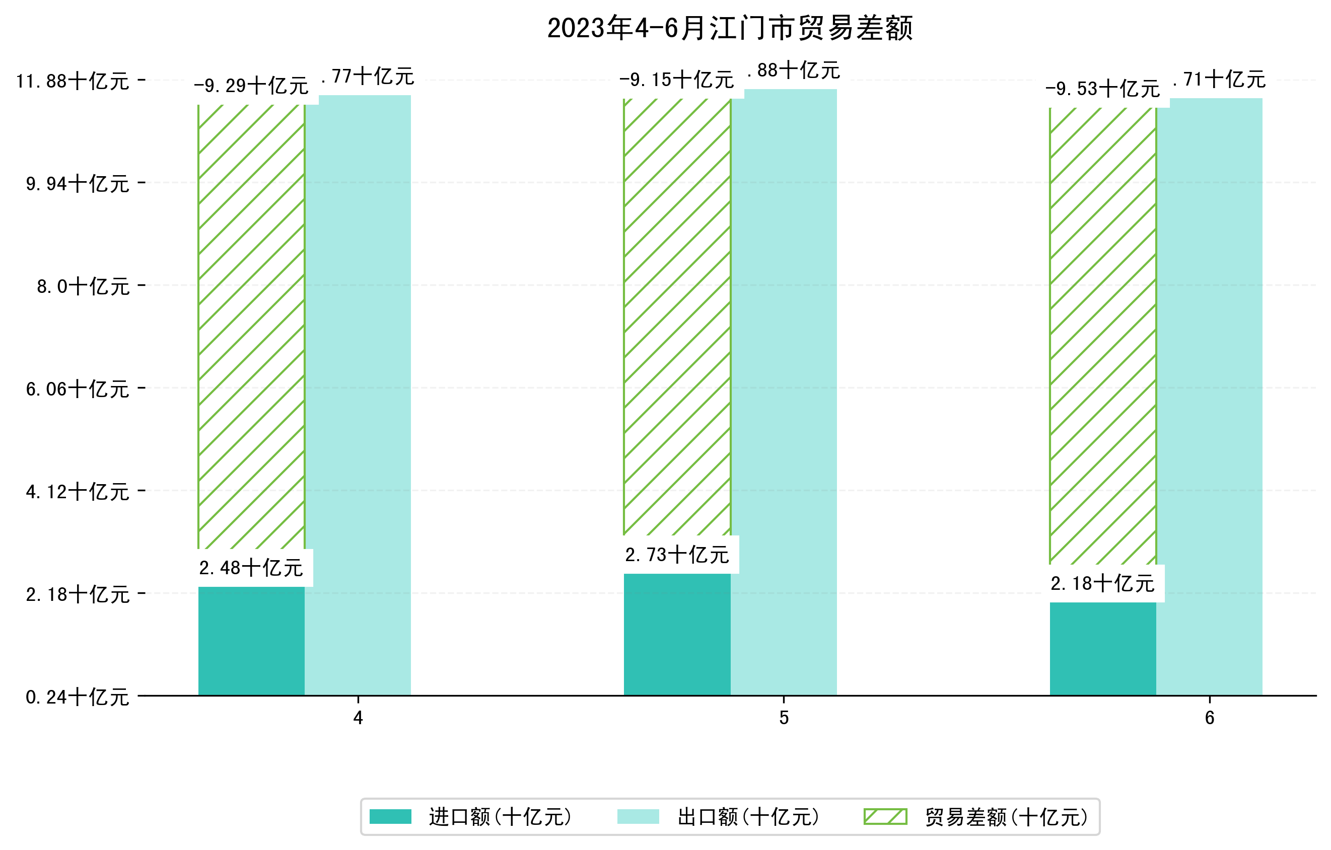 以人民币计,2023年1-6月江门市贸易差额为510,2439,1304万元(贸易顺差),相比上年同期减少了74,7104,8602万元,同比减少-12.77%。