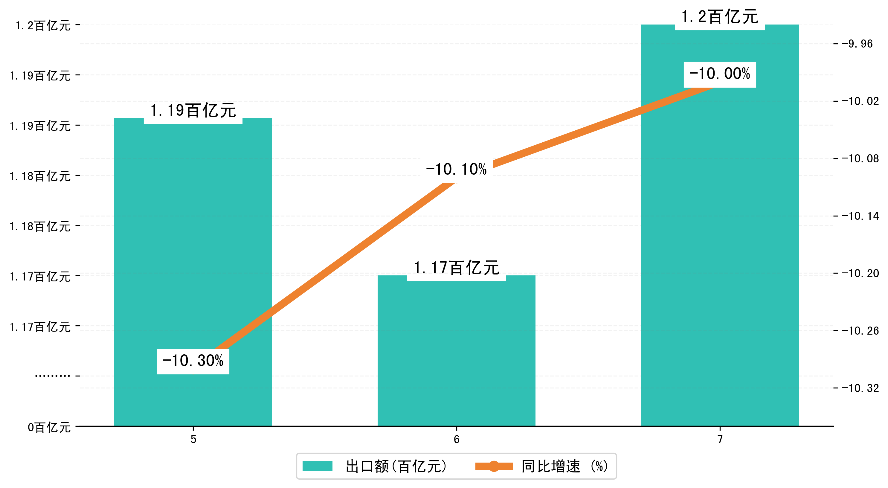 以人民币计,2023年7月江门市出口额为119,7631.1381万元,相比上月增加了2,6471.7951万元;相比上年同期减少了12,0191.8989万元,同比减少了-10.00%。