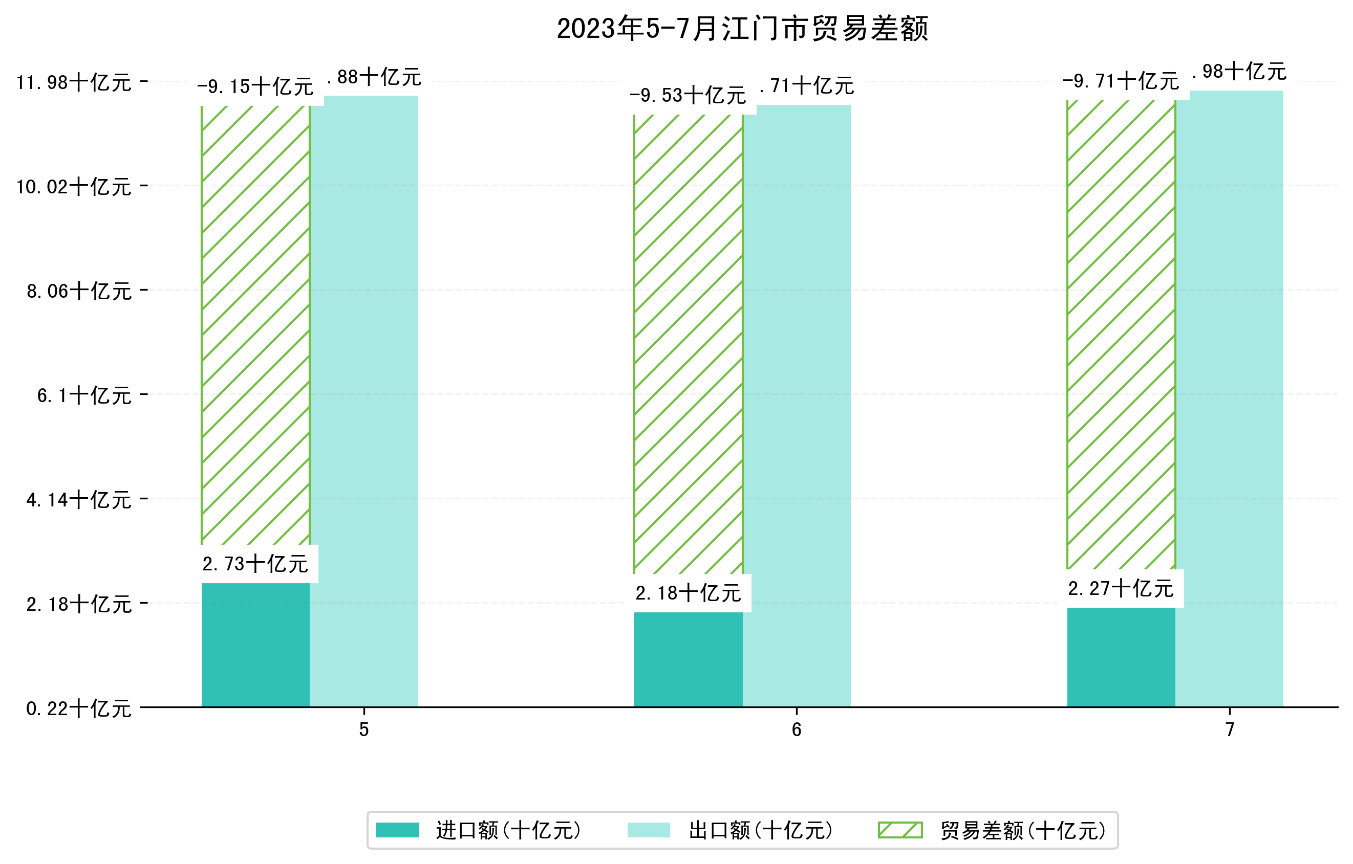 以人民币计,2023年7月江门市贸易差额为97,0815,5034万元(贸易顺差),相比上月增加了1,7787,2328万元,即947,4398万美元;相比上年同期减少了5,0886,7064万元,同比减少-4.98%。