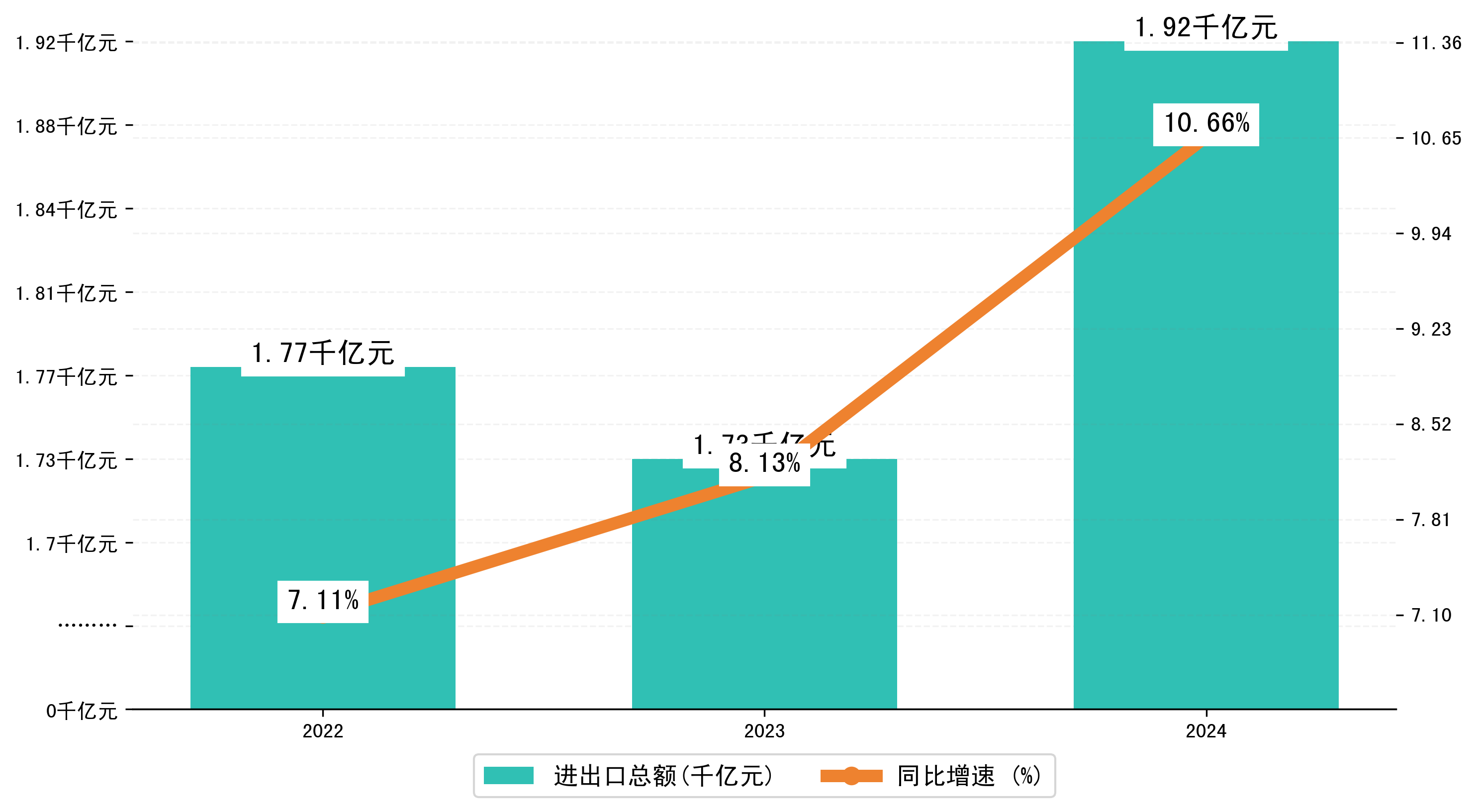以人民币计,2024年1-12月江门市进出口总额为1916,6394.7909万元,相比上年同期增加了184,6302.5642万元,同比增加了10.60%。