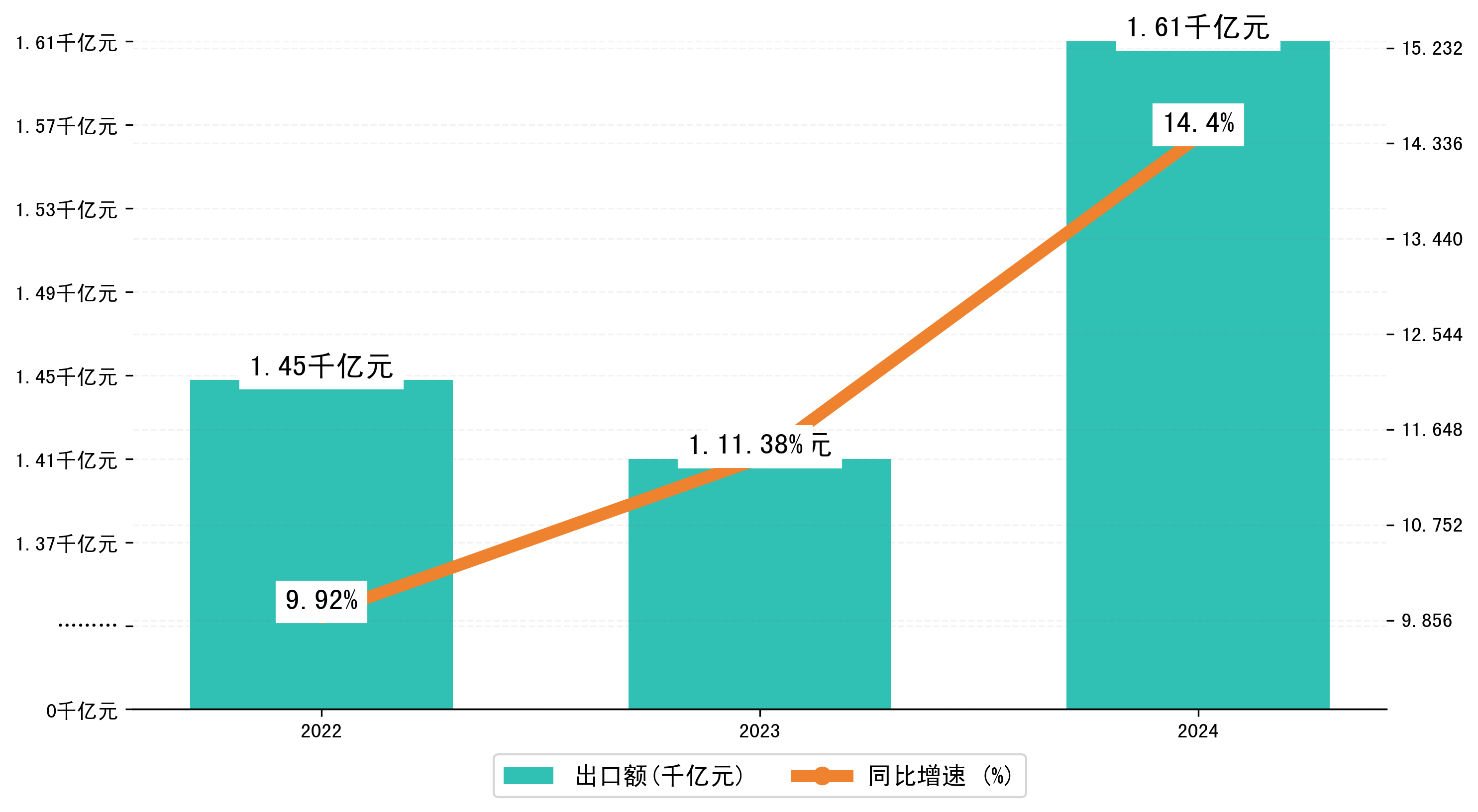 以人民币计,2024年1-12月江门市出口额为1611,1038.1644万元,相比上年同期增加了202,8186.7705万元,同比增加了14.40%。