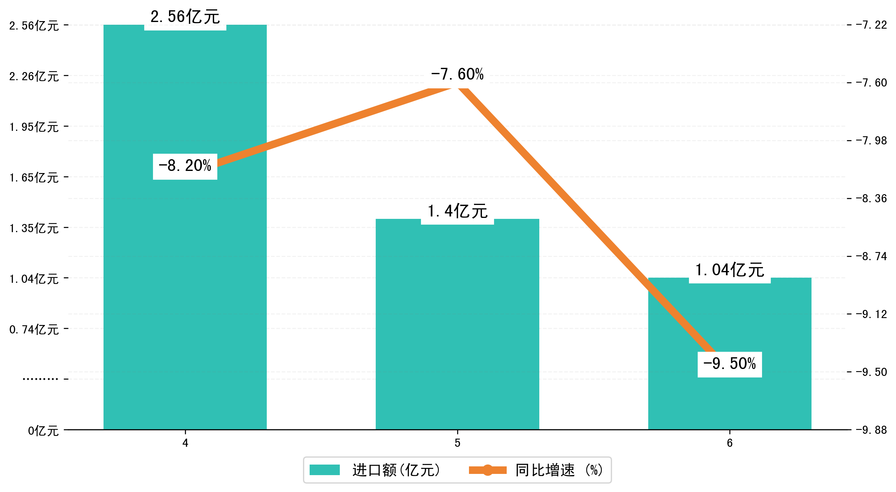以人民币计,2024年1-6月吉林市进口额为9,2947.8081万元,相比上年同期减少了1,0748.2048万元,同比减少了-9.50%。