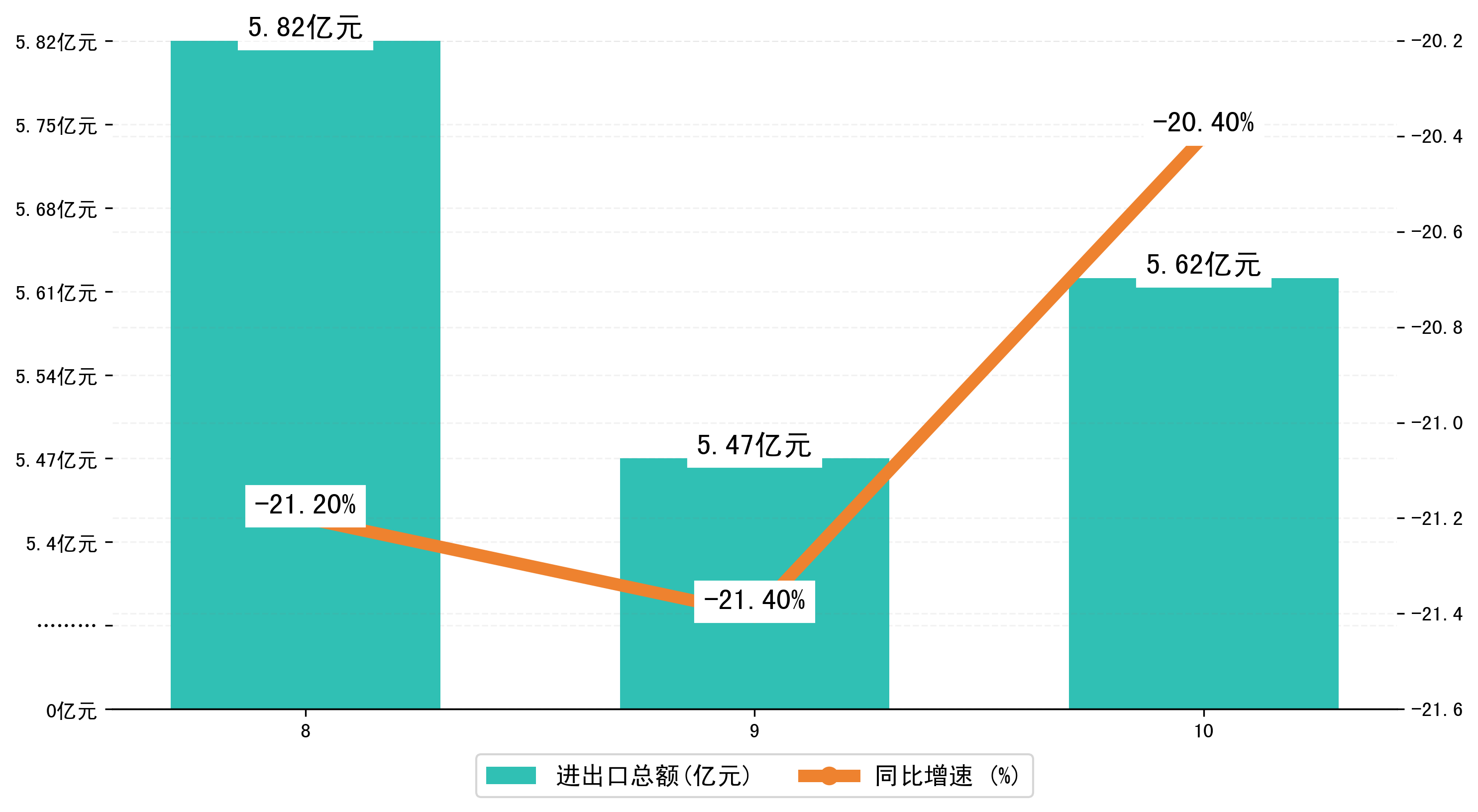 以人民币计,2023年10月吉林市进出口总额为5,6228.6917万元,相比上月增加了1513.3869万元;相比上年同期减少了5891.6853万元,同比减少了-20.40%。