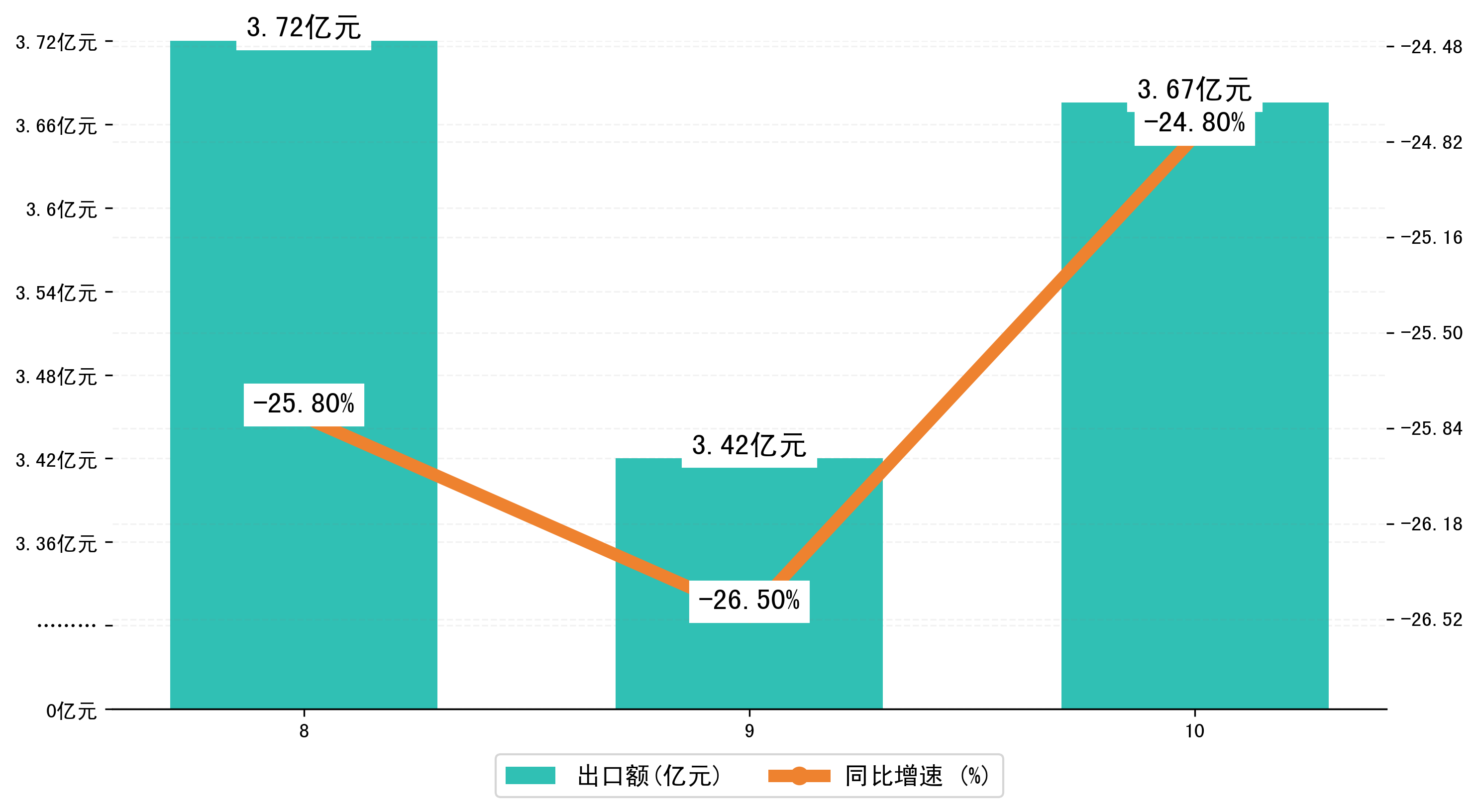 以人民币计,2023年10月吉林市出口额为3,6723.7428万元,相比上月增加了2516.3585万元;相比上年同期减少了2091.5824万元,同比减少了-24.80%。