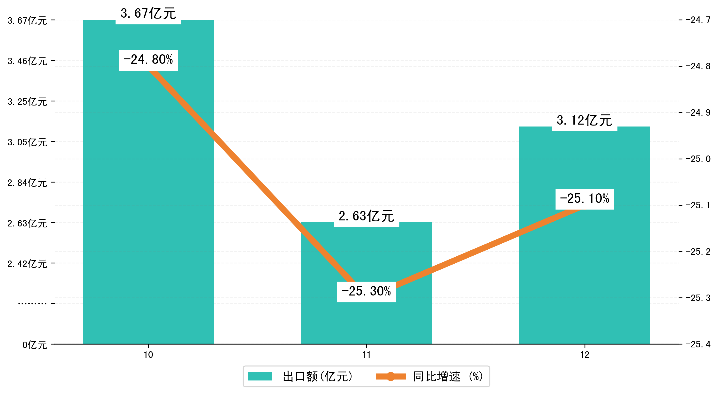 以人民币计,2023年1-12月吉林市出口额为41,8009.0153万元,相比上年同期减少了14,0510.8643万元,同比减少了-25.10%。
