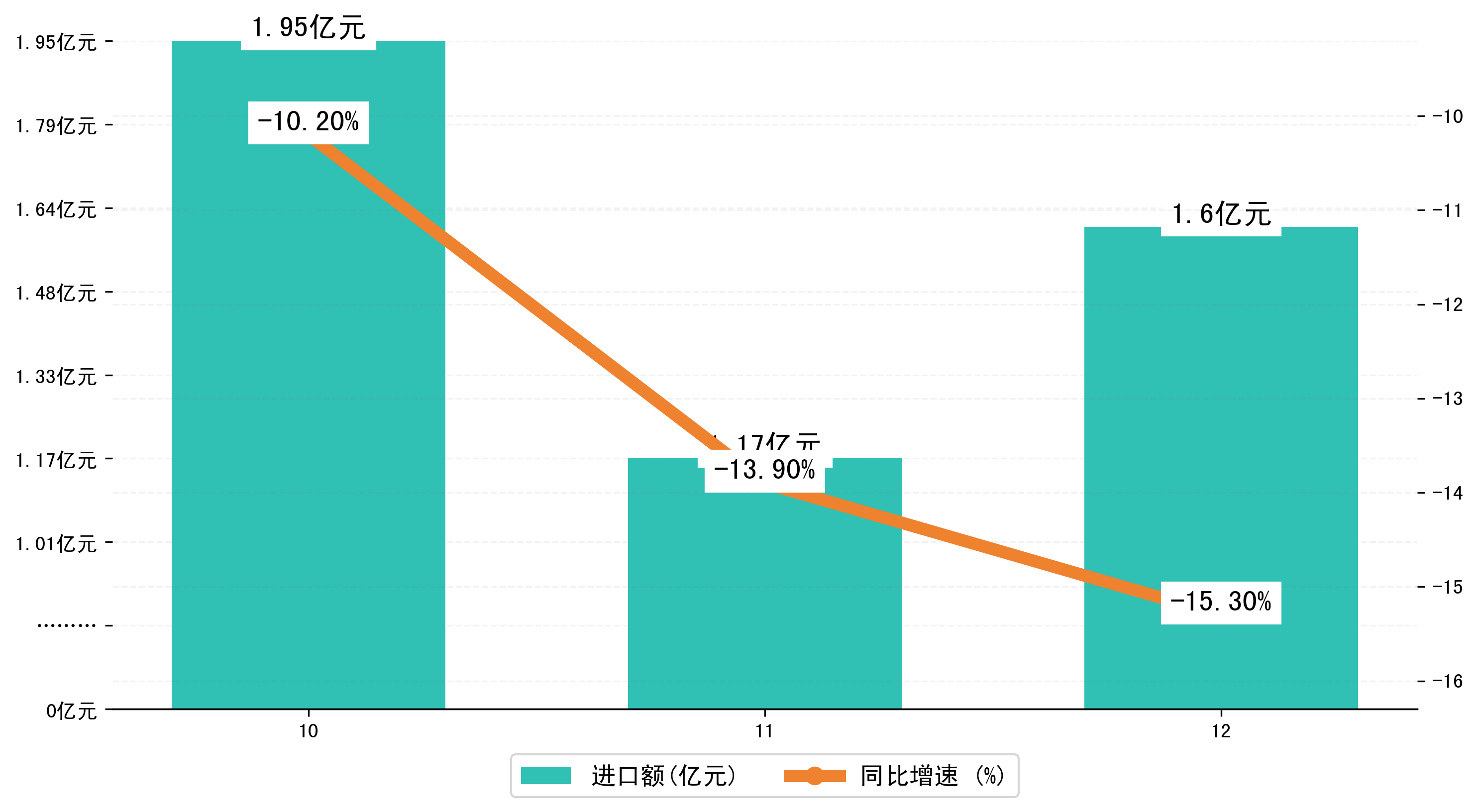 以人民币计,2023年1-12月吉林市进口额为21,0501.7216万元,相比上年同期减少了3,6047.6988万元,同比减少了-15.30%。