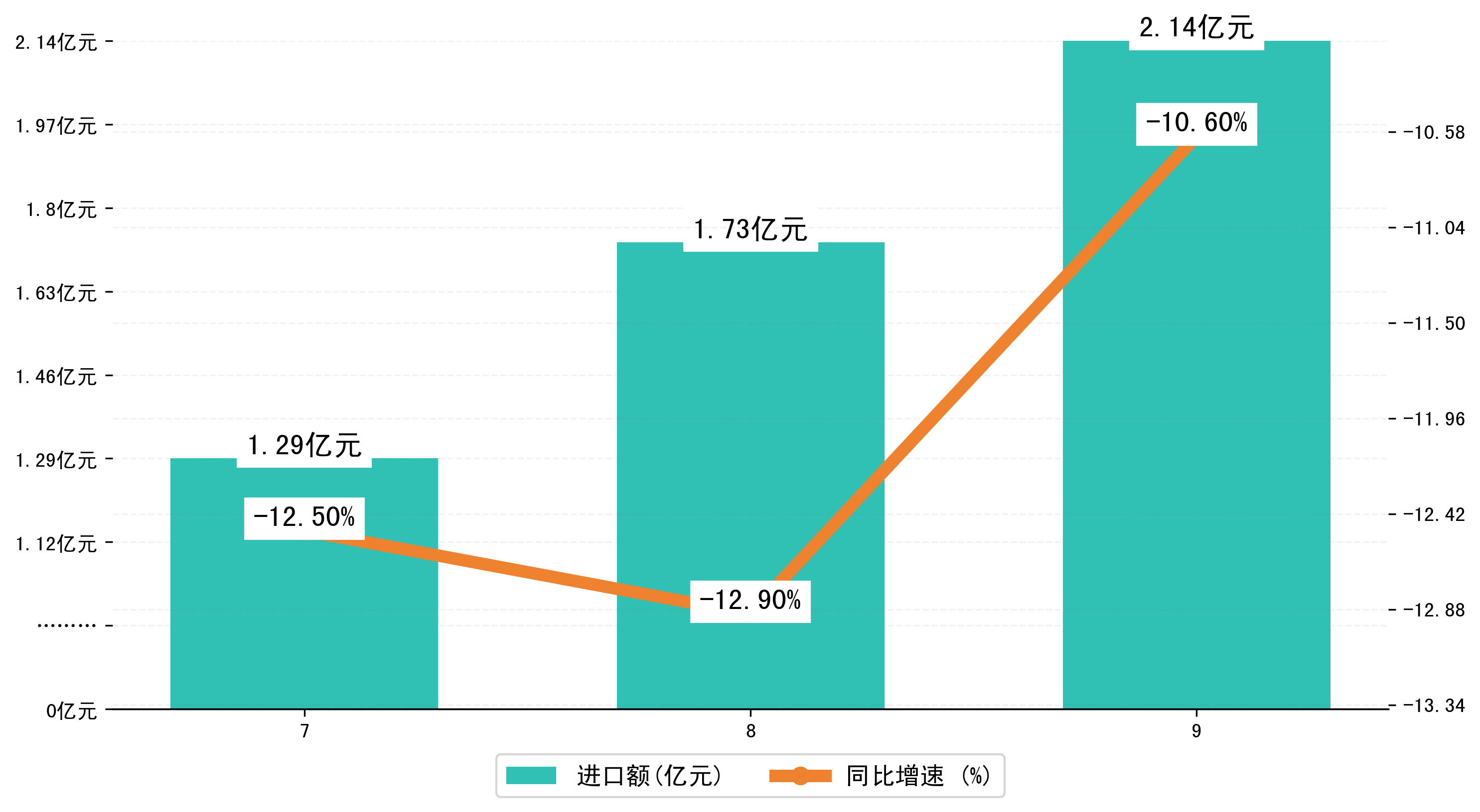 以人民币计,2024年1-9月吉林市进口额为14,5614.8694万元,相比上年同期减少了1,8218.1062万元,同比减少了-10.60%。