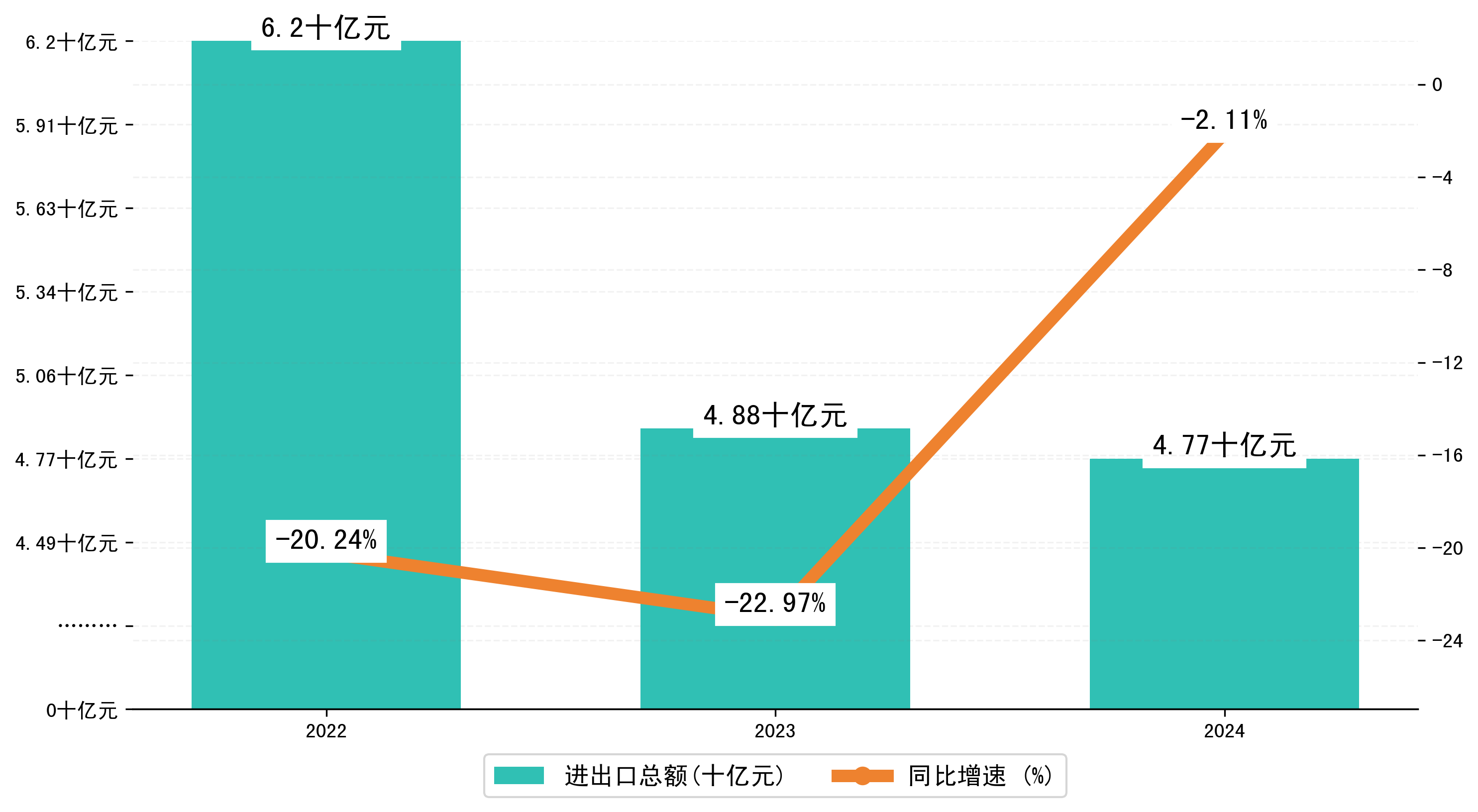 以人民币计,2024年1-9月吉林市进出口总额为47,7335.7557万元,相比上年同期减少了1,0270.9524万元,同比减少了-1.90%。