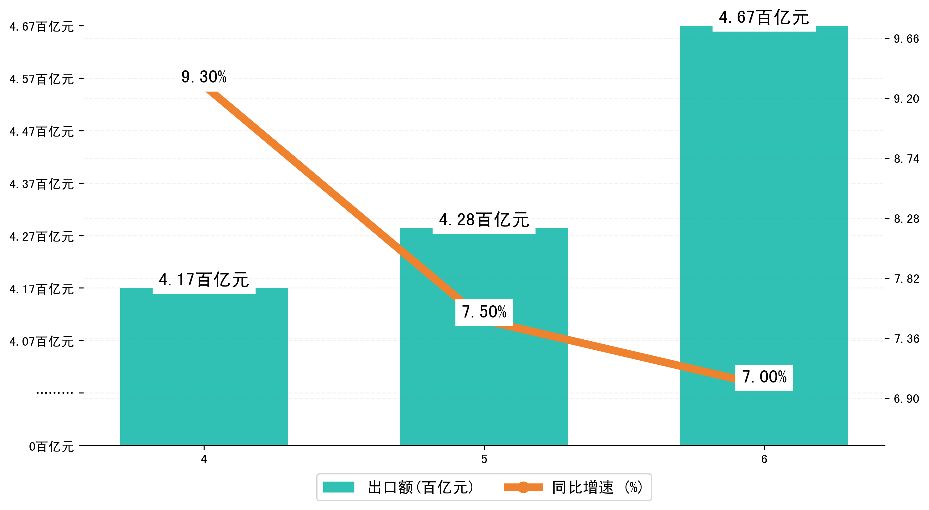以人民币计,2025年6月重庆市出口额为466,7395.2808万元,相比上月增加了38,4363.9016万元;相比上年同期增加了19,8779.4897万元,同比增加了7.00%。