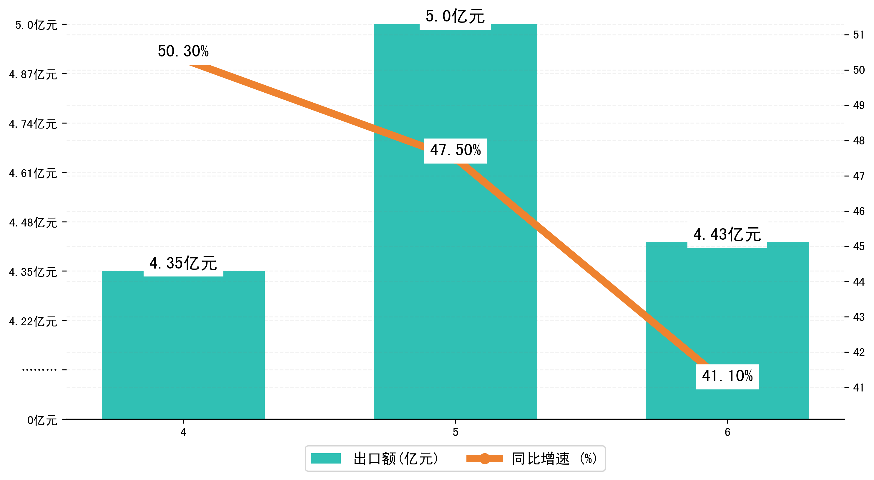 以美元计,2025年1-6月吉林市出口额为3,9654.3546万美元,相比上年同期增加了1,1234.7179万美元,同比增加39.50%。