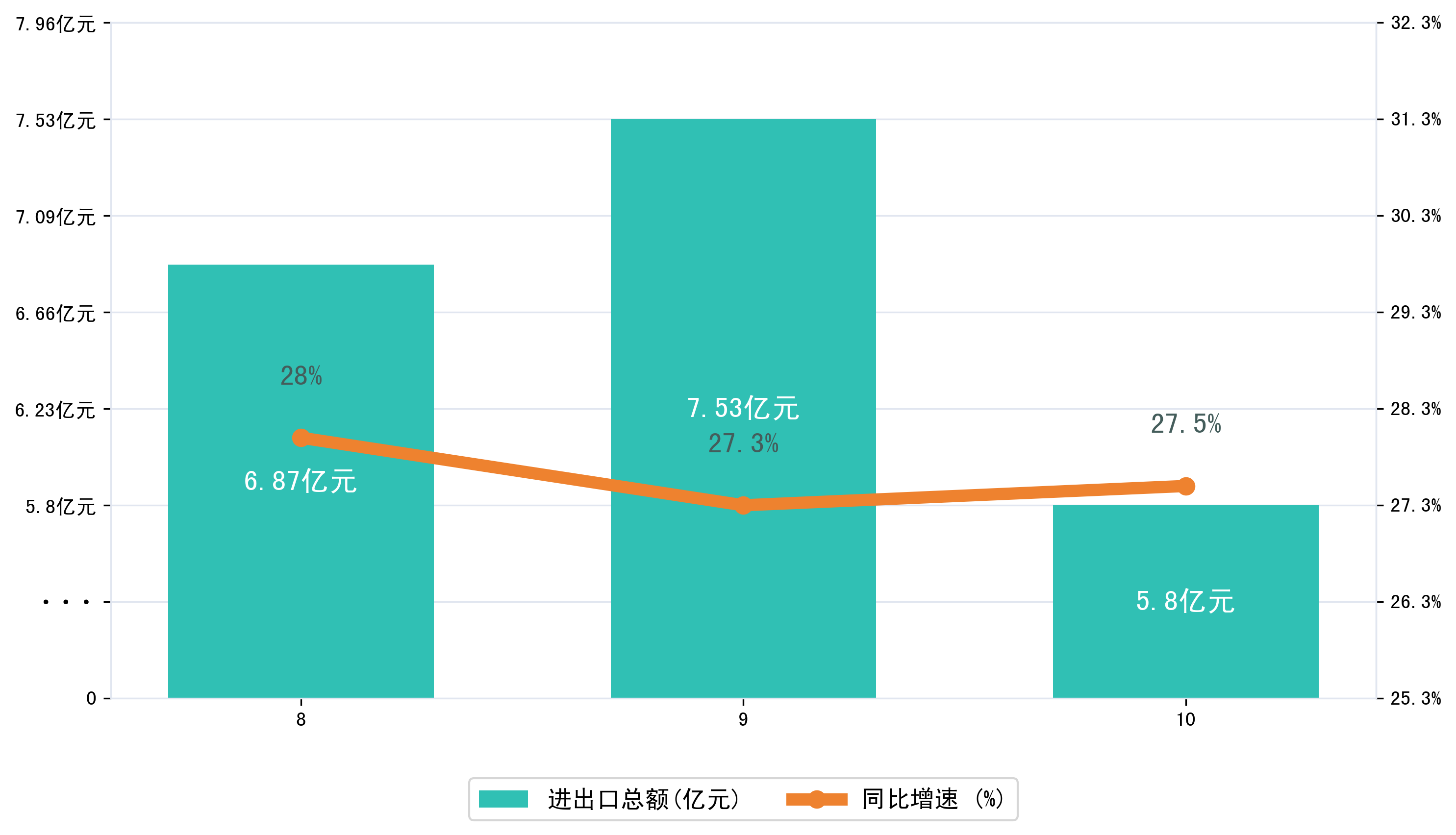 以人民币计,2025年1-10月吉林市进出口总额为66,5915.8586万元,相比上年同期增加了14,3651.0031万元,同比增加了27.50%。