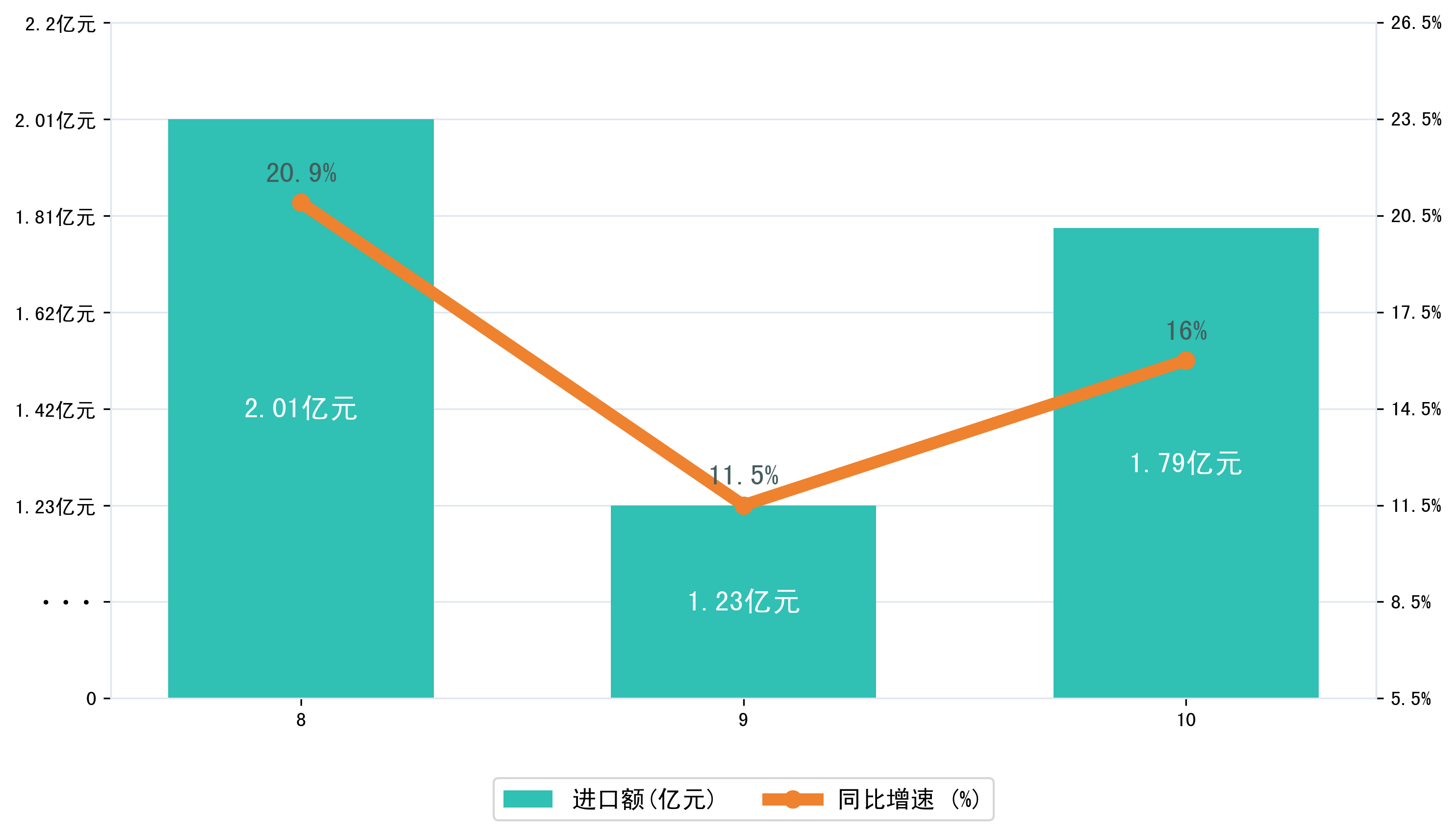 以人民币计,2025年10月吉林市进口额为1,7859.0616万元,相比上月增加了5561.6786万元;相比上年同期增加了8066.5166万元,同比增加了16.00%。
