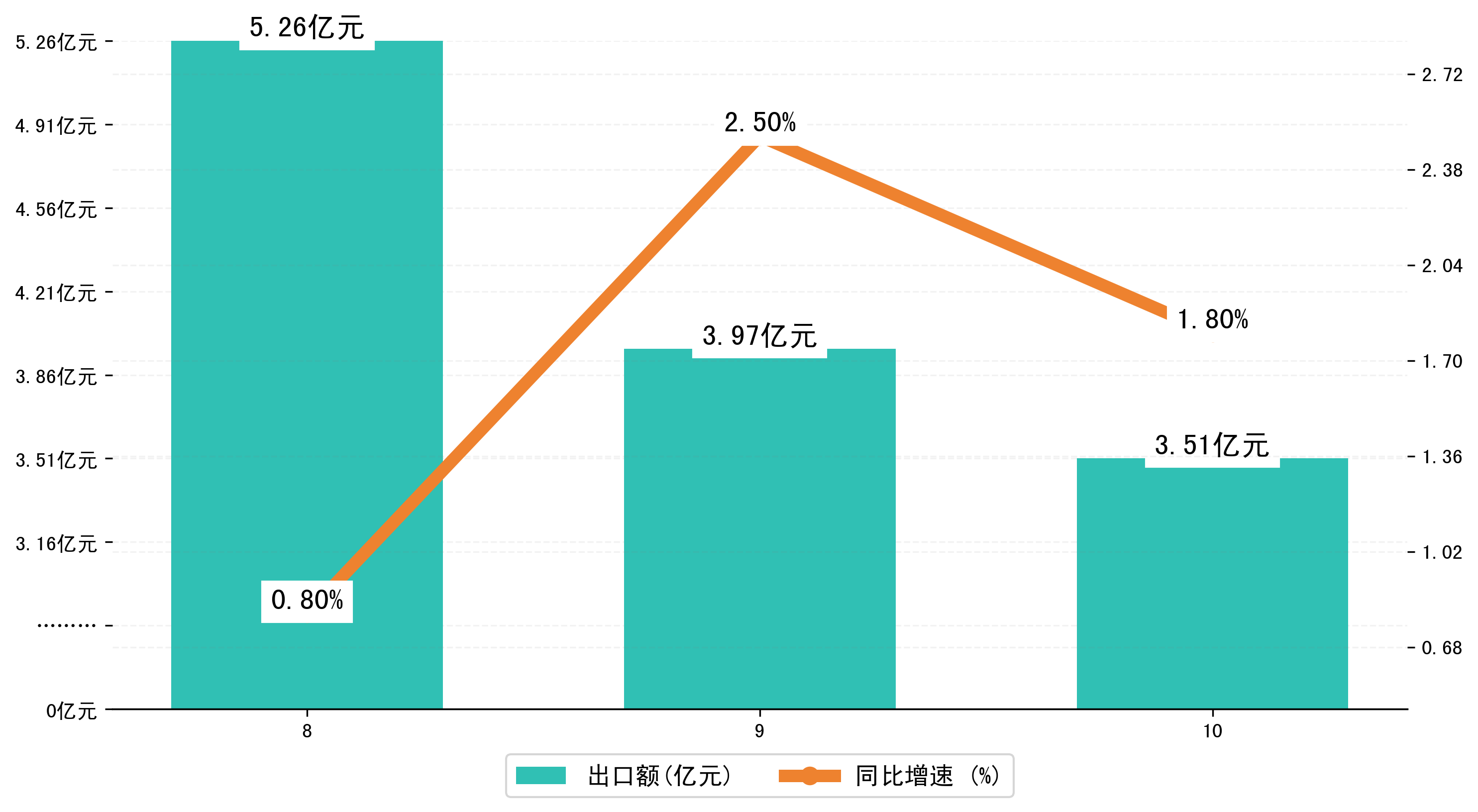 以人民币计,2024年1-10月吉林市出口额为36,6857.4411万元,相比上年同期增加了6359.9658万元,同比增加了1.80%。