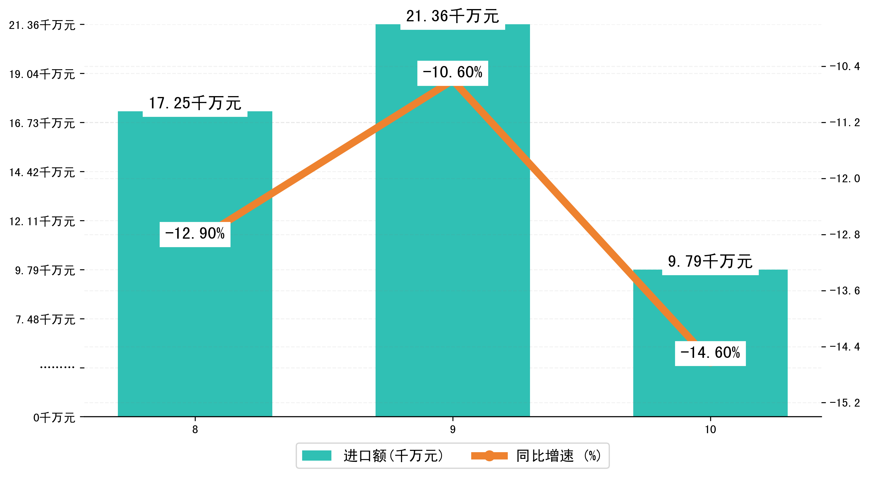 以人民币计,2024年1-10月吉林市进口额为15,5407.4144万元,相比上年同期减少了2,7519.9648万元,同比减少了-14.60%。