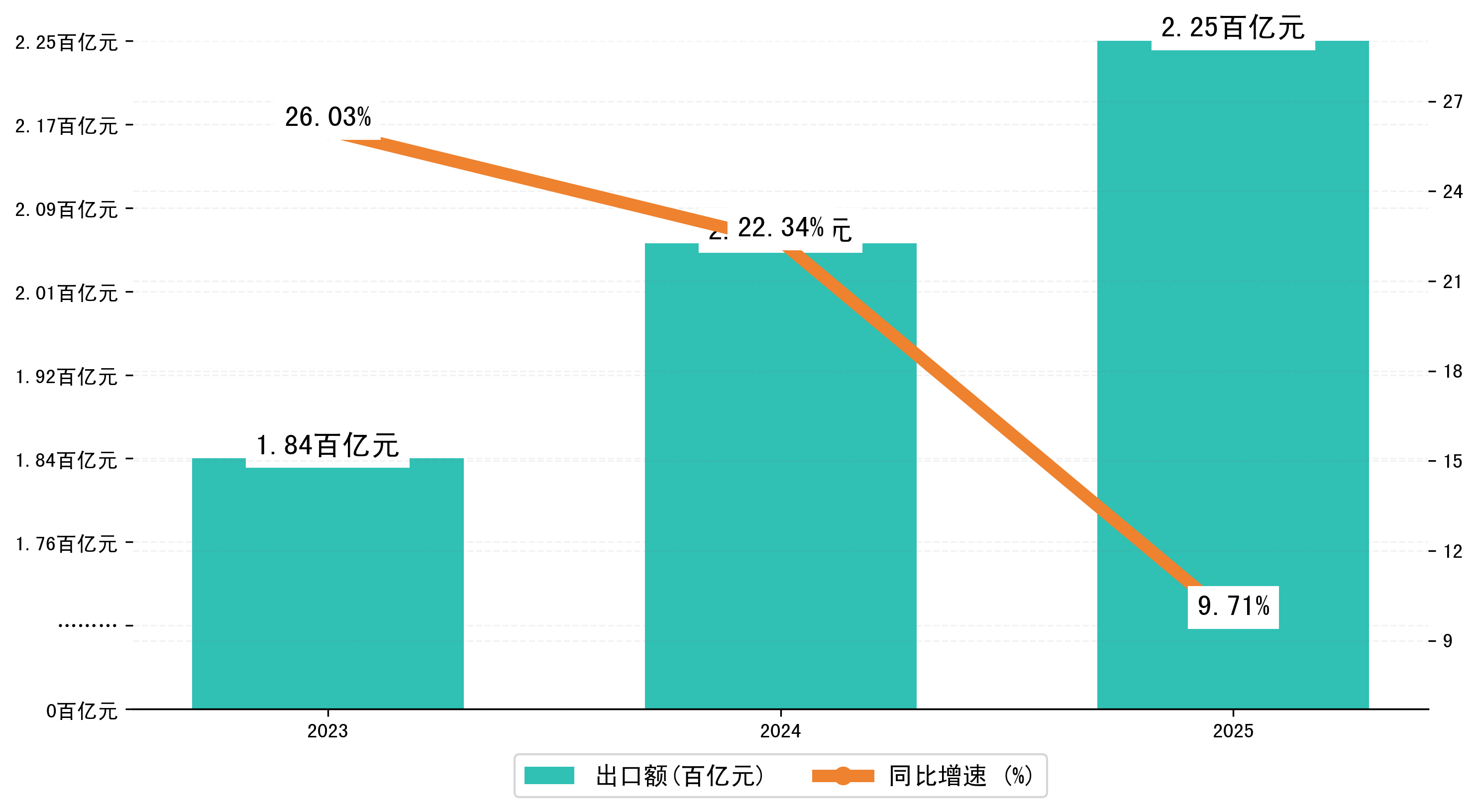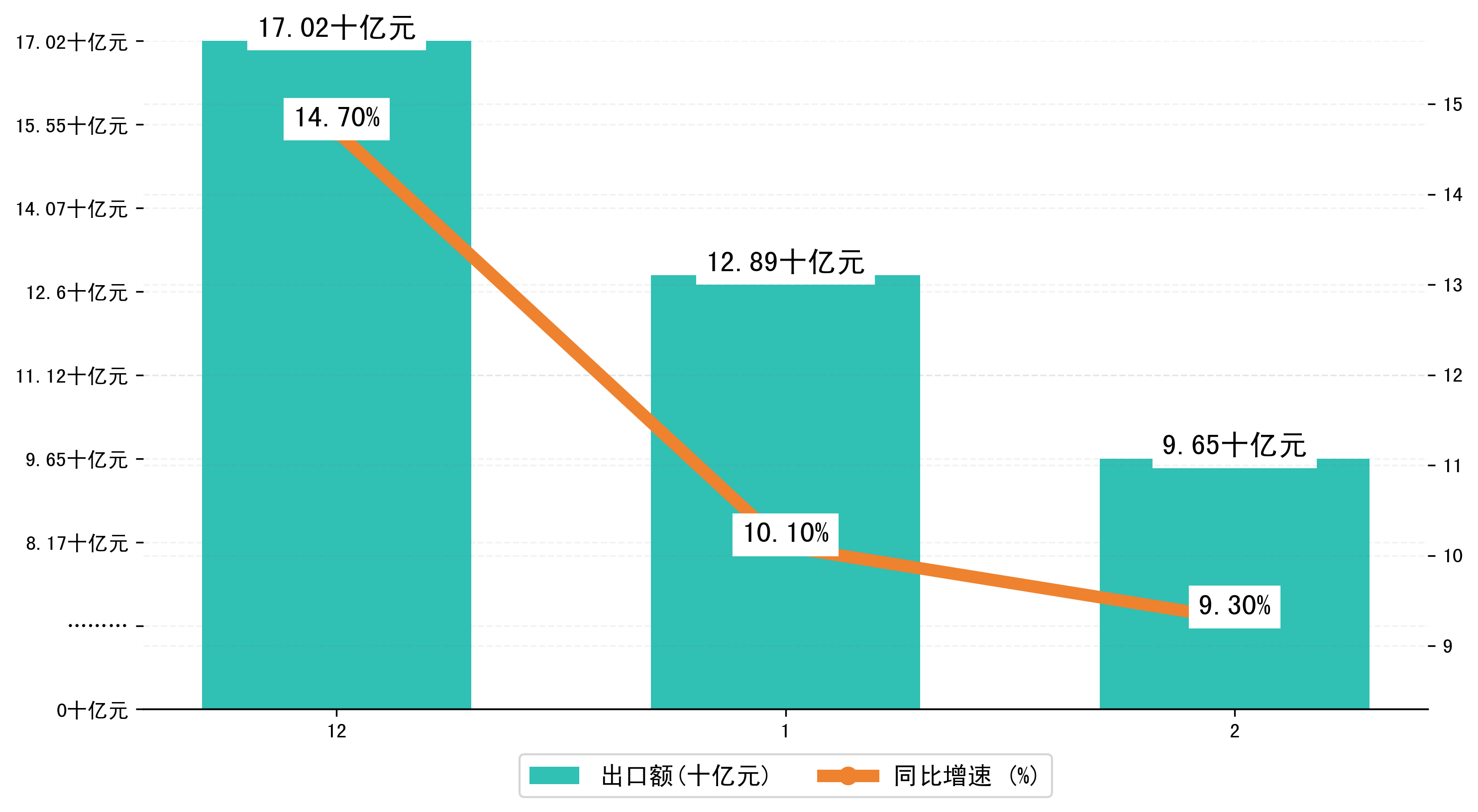 以人民币计,2025年1-2月济南市出口额为225,3228.0804万元,相比上年同期增加了19,9458.9559万元,同比增加了9.30%。