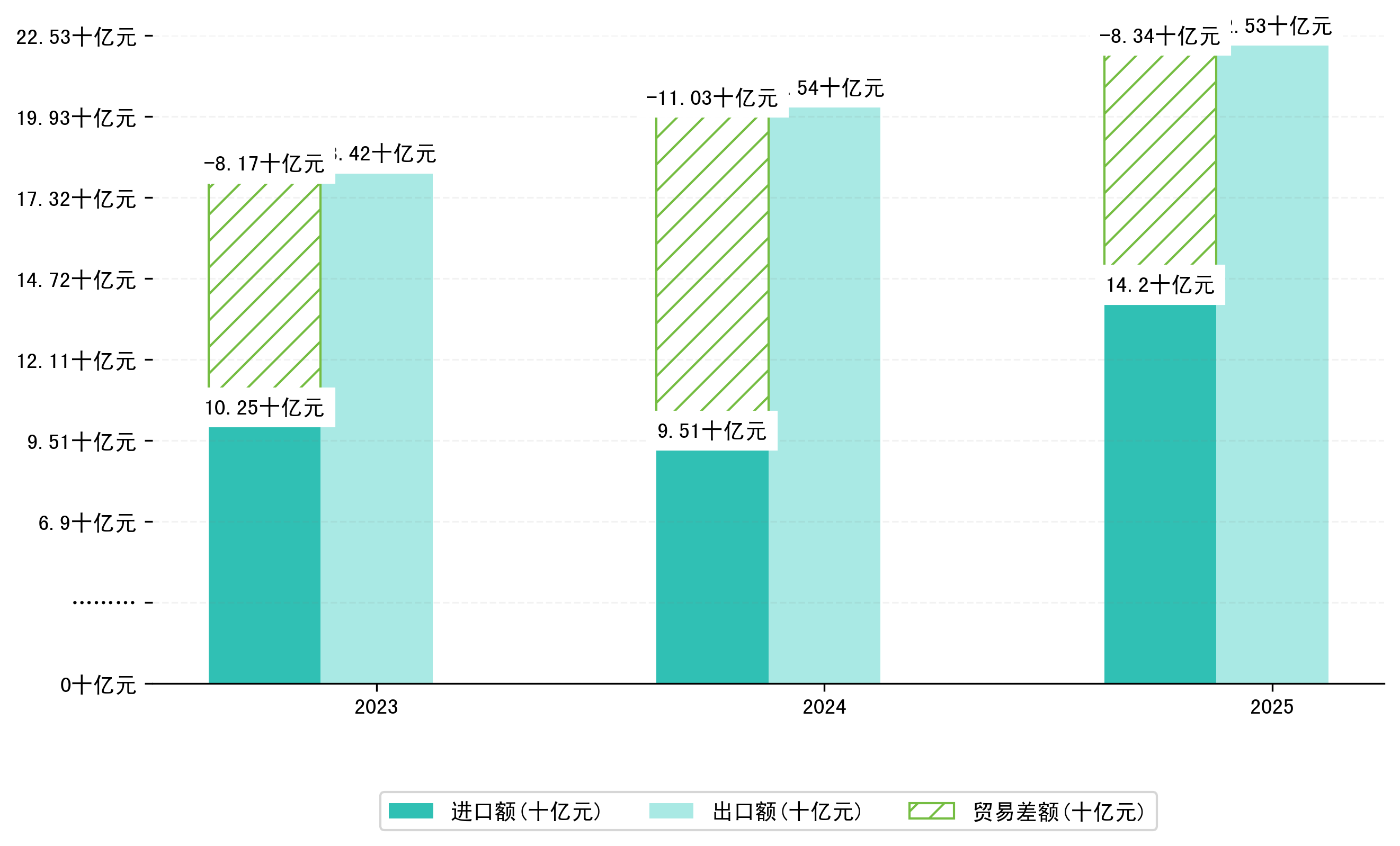 以美元计,2025年1-2月济南市贸易差额为11,5960,7553万美元(贸易顺差),相比上年同期减少了3,9122,7532万美元,同比减少-25.23%。