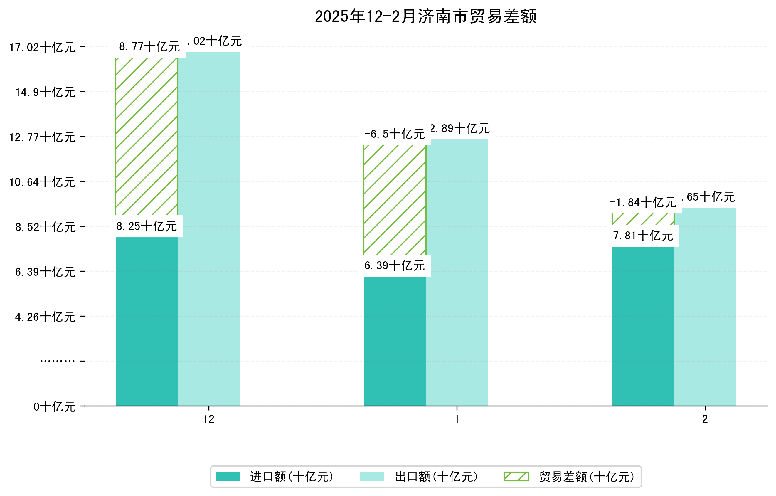 以人民币计,2025年1-2月济南市贸易差额为83,3717,0538万元(贸易顺差),相比上年同期减少了26,9457,3664万元,同比减少-24.43%。