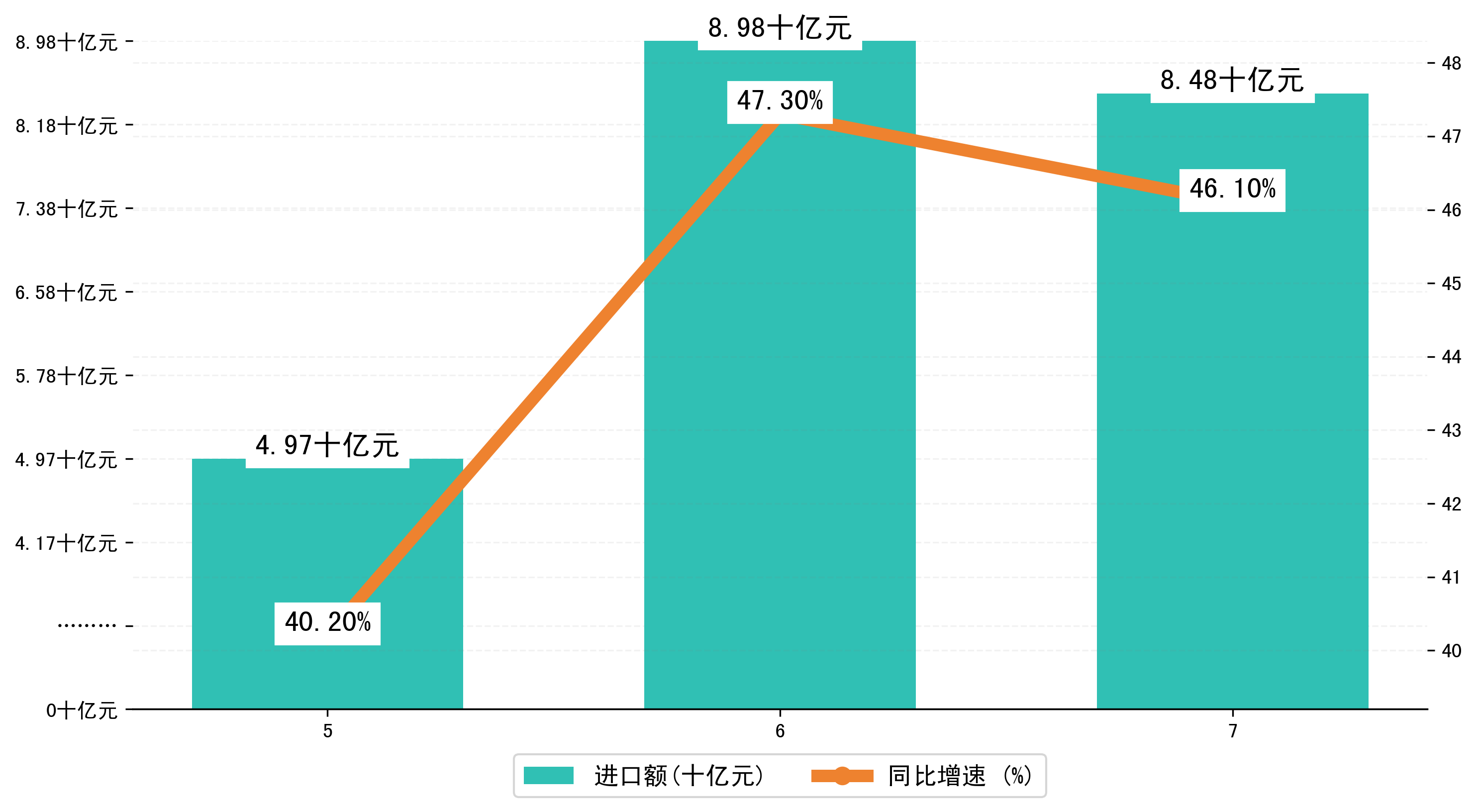 以人民币计,2025年7月济南市进口额为84,7753.1567万元,相比上月减少了5,0478.5858万元;相比上年同期增加了24,2317.1411万元,同比增加了46.10%。