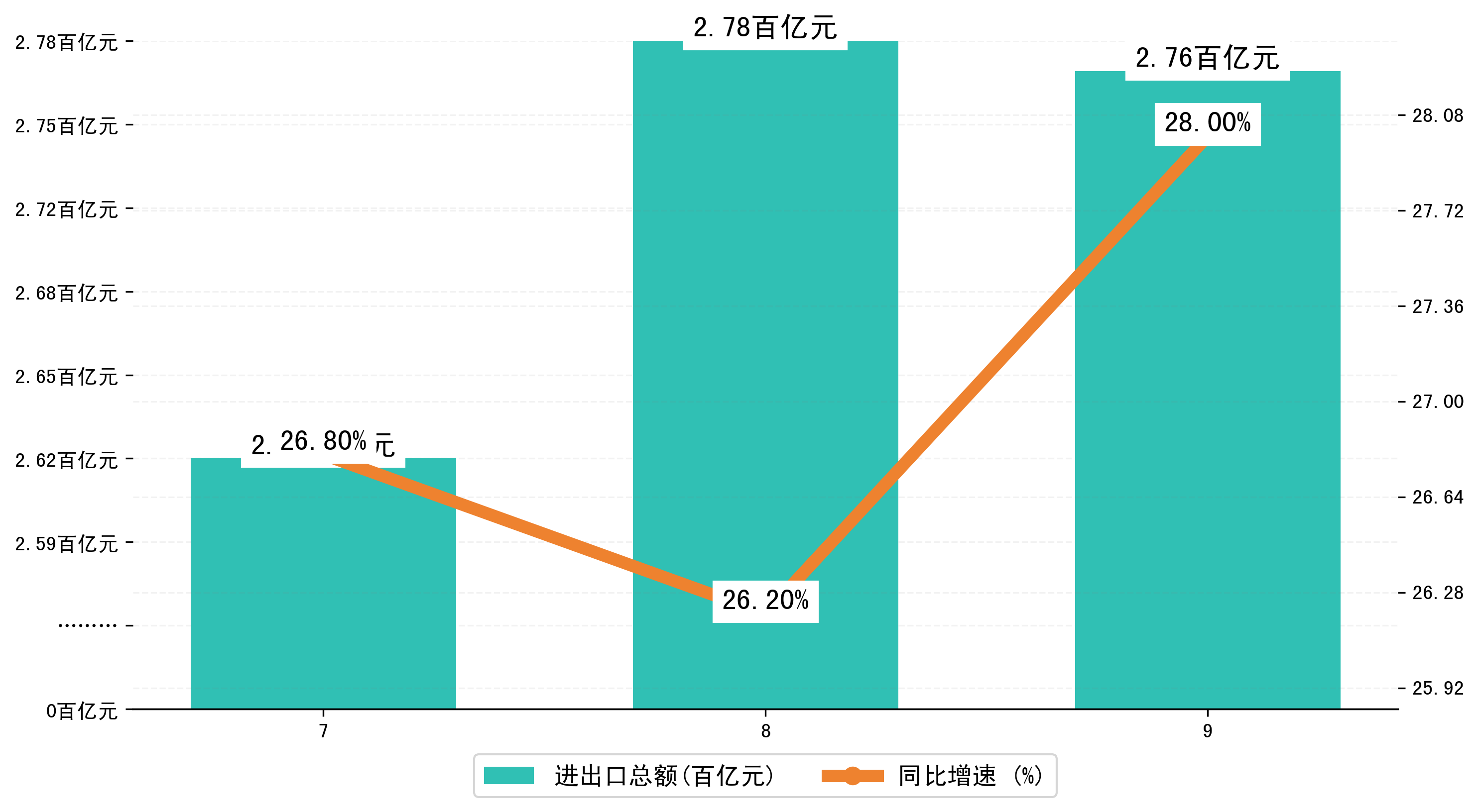 以人民币计,2025年9月济南市进出口总额为276,4582.3517万元,相比上月减少了1,0980.6138万元;相比上年同期增加了80,1003.2628万元,同比增加了28.00%。