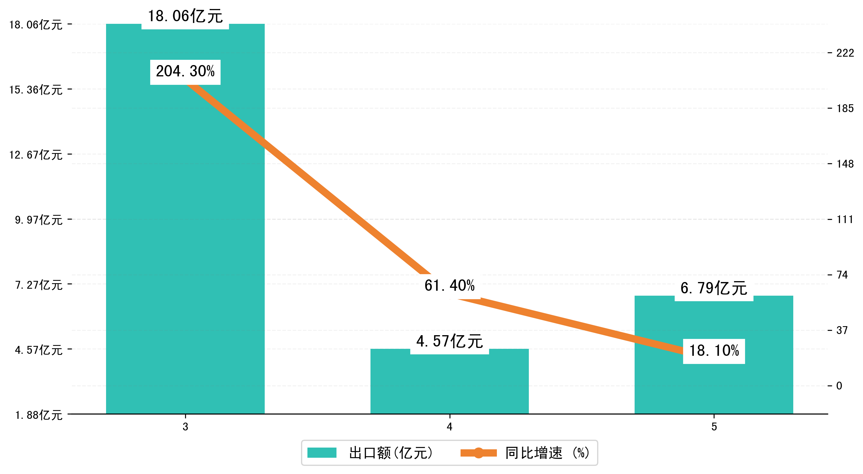 以人民币计,2023年5月景德镇市出口额为6,7867.7213万元,相比上月增加了2,2125.8386万元;相比上年同期减少了11,7382.2987万元,同比增加了18.10%。