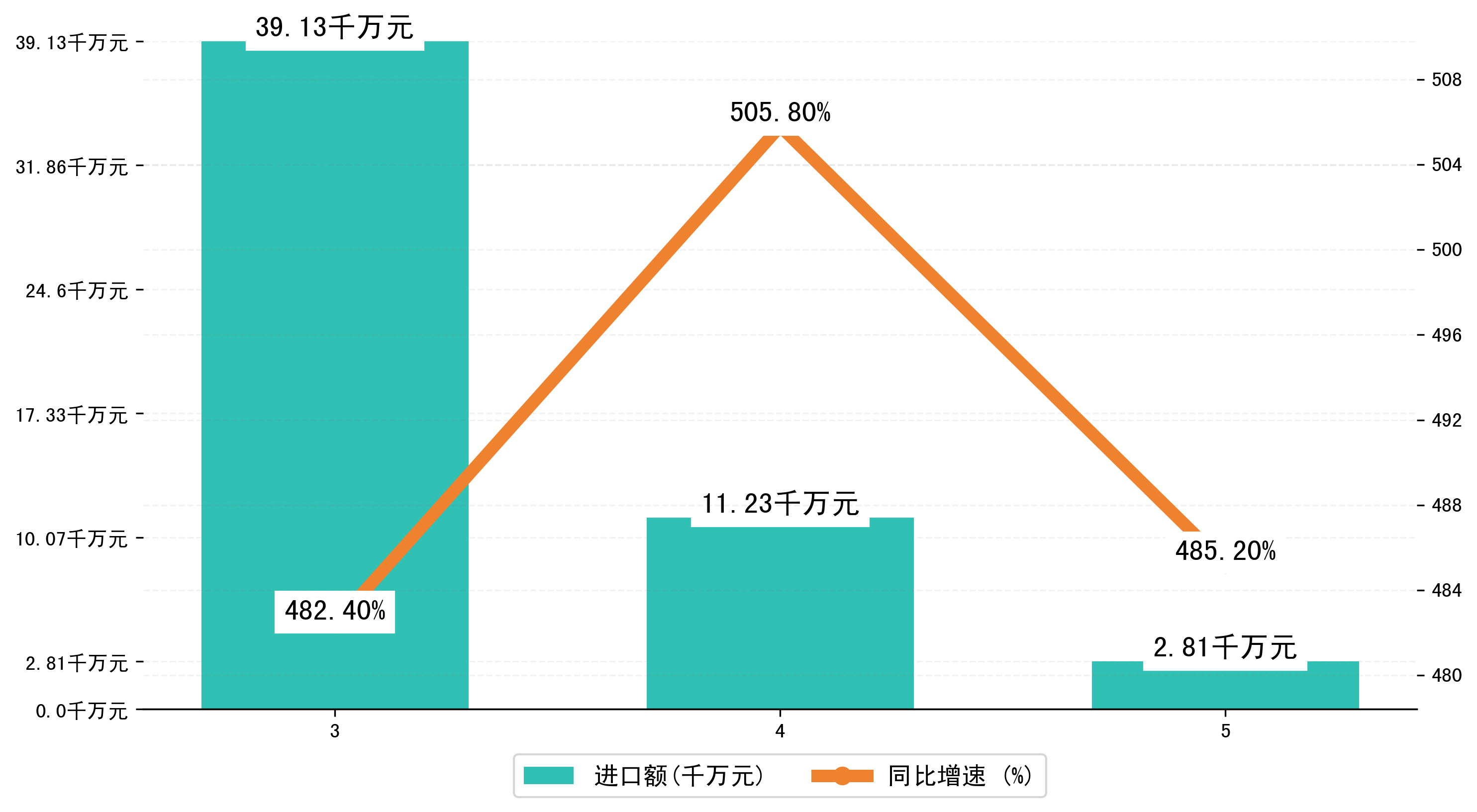以人民币计,2023年5月景德镇市进口额为2805.6126万元,相比上月减少了8421.7792万元;相比上年同期增加了903.585万元,同比增加了485.20%。