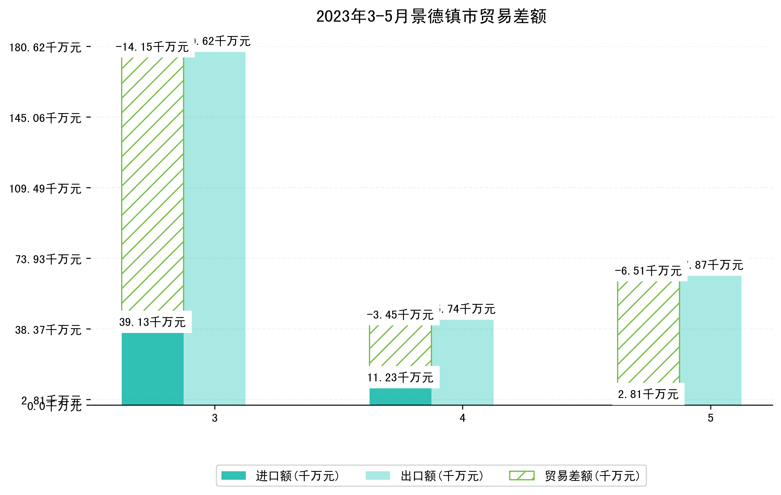 以人民币计,2023年1-5月景德镇市贸易差额为38,2466,3300万元(贸易顺差),相比上年同期减少了10,9164,5737万元,同比减少-22.2%。