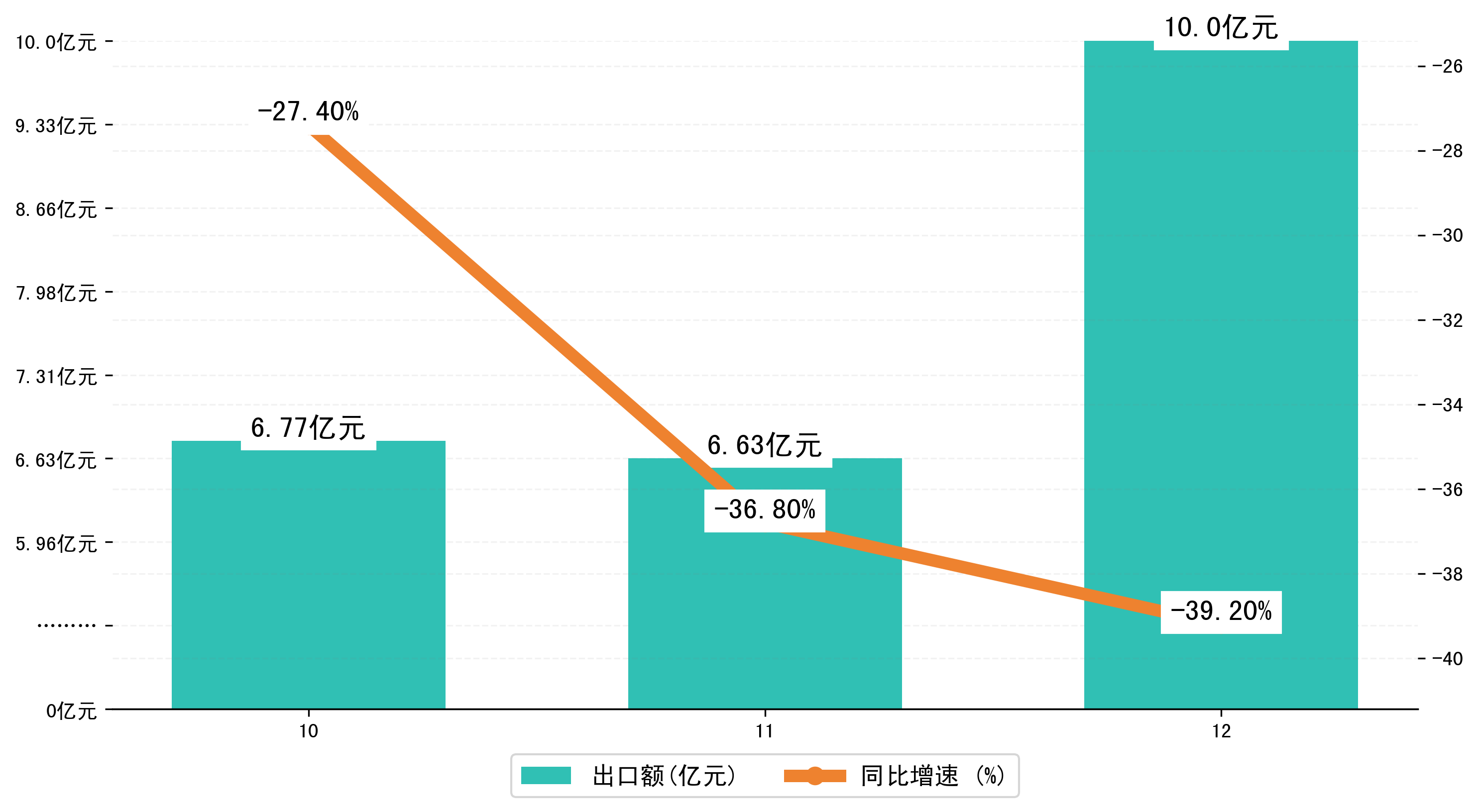 以美元计,2023年12月景德镇市出口额为1,3955.1304万美元,相比上月增加了4719.6646万美元;相比上年同期减少了1,7646.801万美元,同比减少-41.50%。
