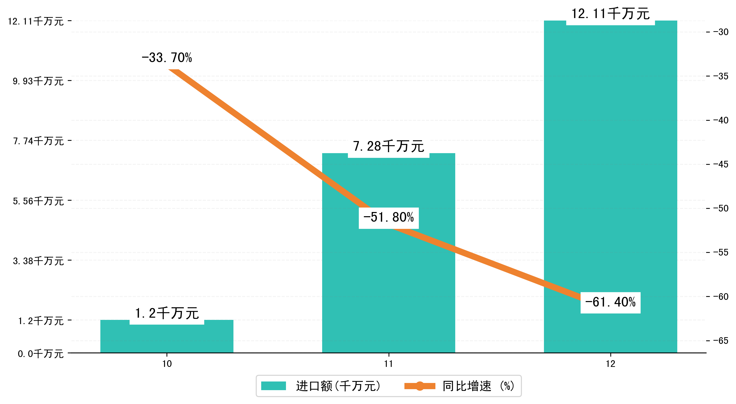 以人民币计,2023年12月景德镇市进口额为1,2107.512万元,相比上月增加了4830.3784万元;相比上年同期减少了16,6549.2255万元,同比减少了-61.40%。