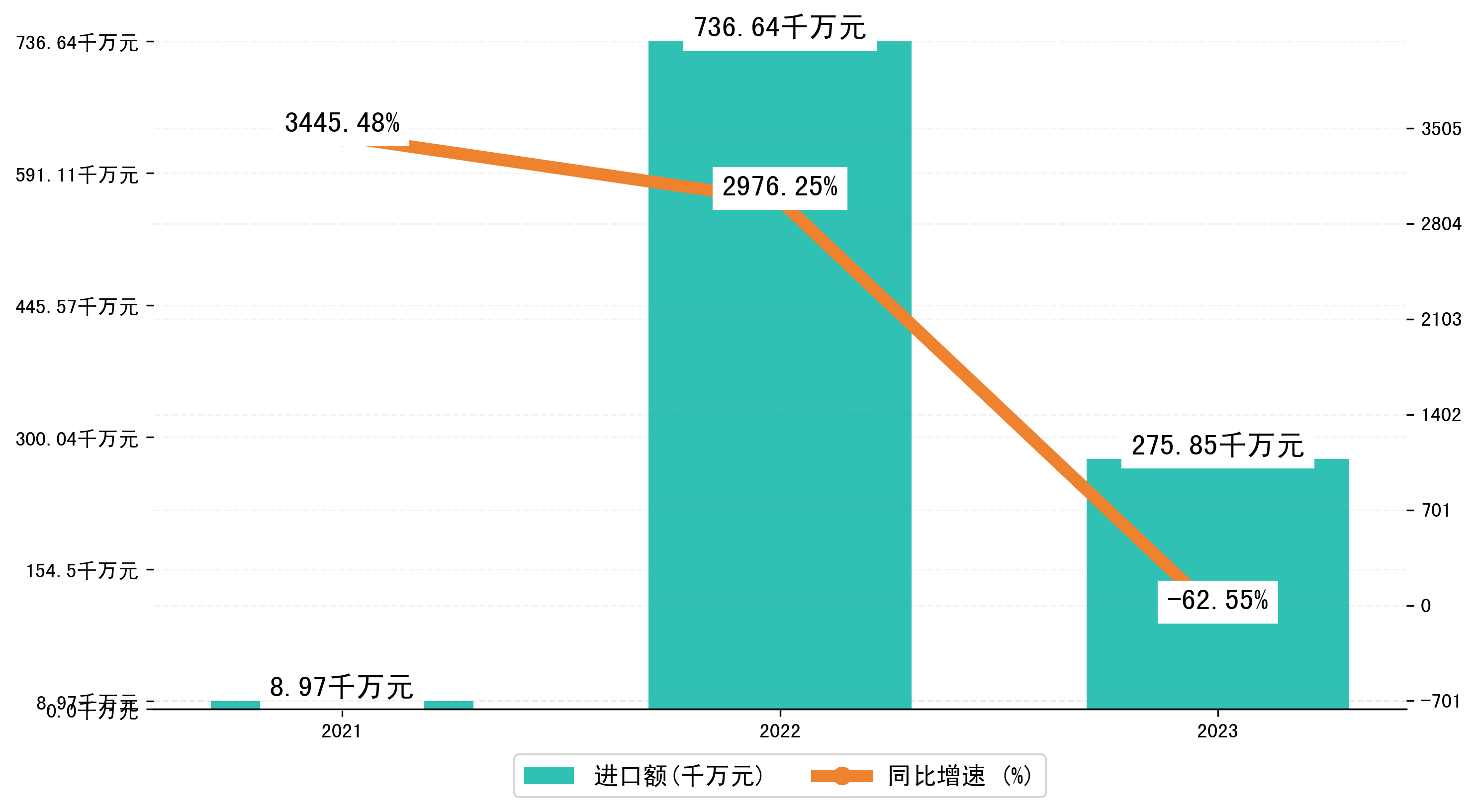 以人民币计,2023年1-12月景德镇市进口额为27,5854.1328万元,相比上年同期减少了46,0786.642万元,同比减少了-61.40%。