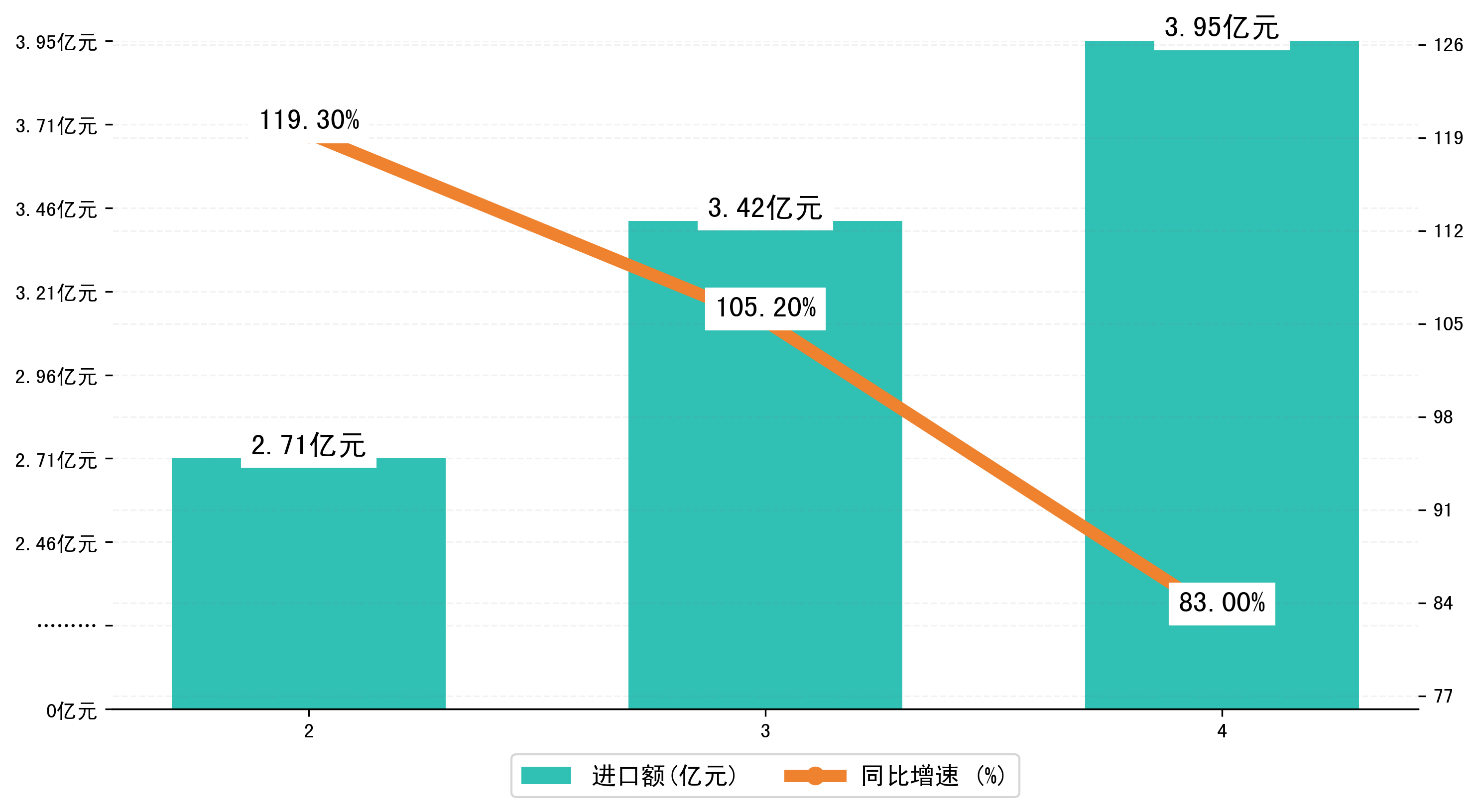 以人民币计,2023年4月常德市进口额为3,9543.8089万元,相比上月增加了5373.6493万元;相比上年同期增加了1,1834.7499万元,同比增加了83.00%。