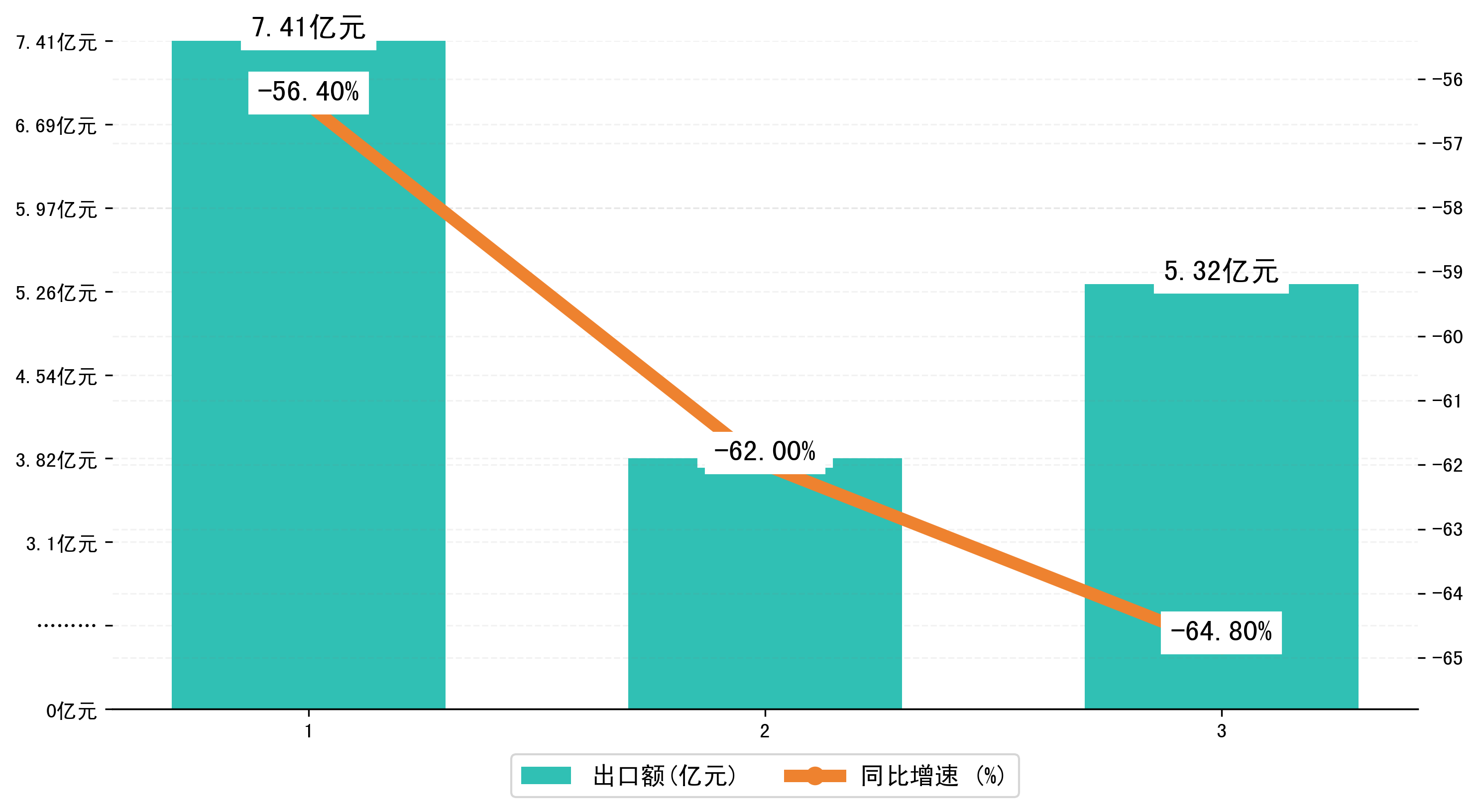 以美元计,2024年1-3月景德镇市出口额为2,3287.147万美元,相比上年同期减少了5,1276.7388万美元,同比减少-65.70%。
