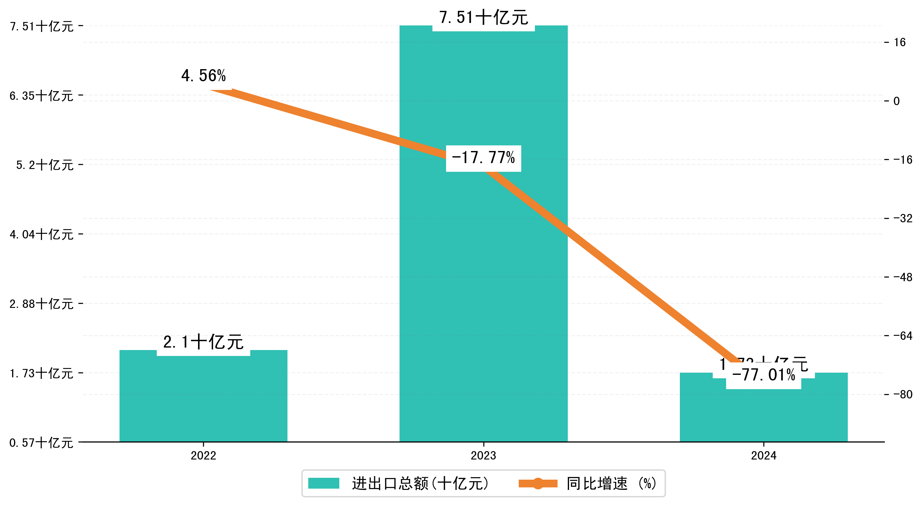 以人民币计,2024年1-3月景德镇市进出口总额为17,2706.3082万元,相比上年同期减少了57,8376.0426万元,同比减少了-75.50%。