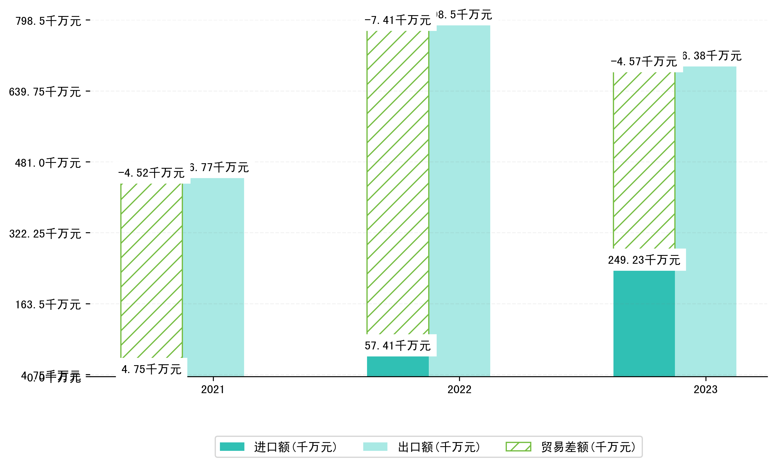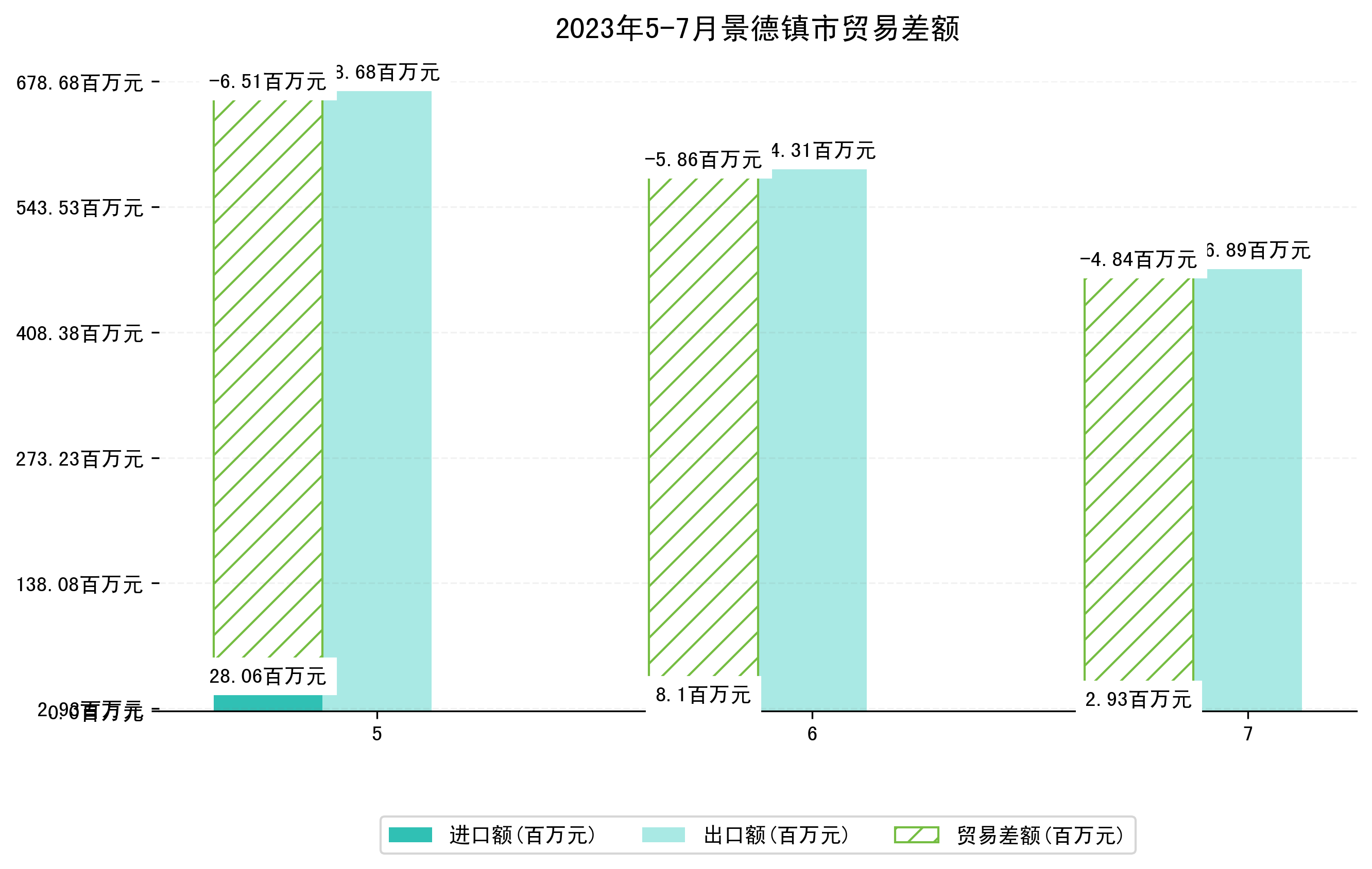 以人民币计,2023年1-7月景德镇市贸易差额为45,7151,5112万元(贸易顺差),相比上年同期减少了28,3933,8979万元,同比减少-38.31%。