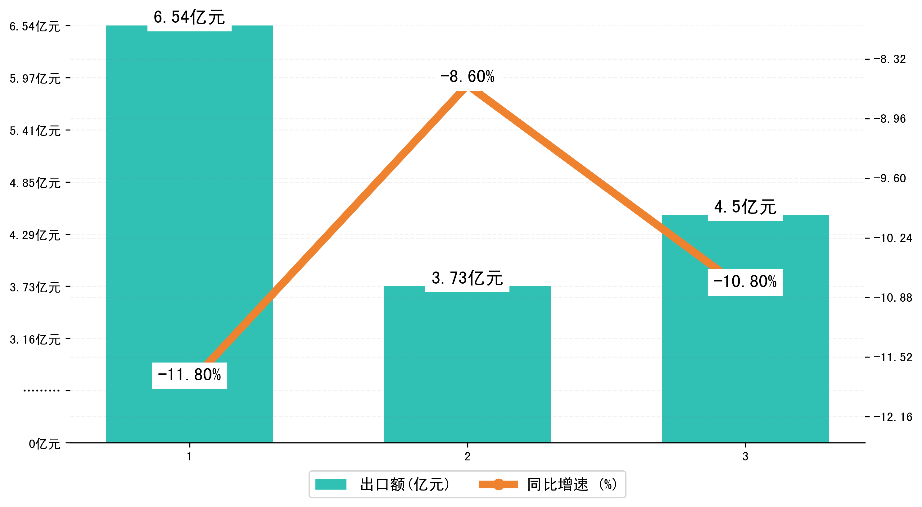 以美元计,2025年1-3月景德镇市出口额为2,0542.1047万美元,相比上年同期减少了2745.0423万美元,同比减少-11.80%。
