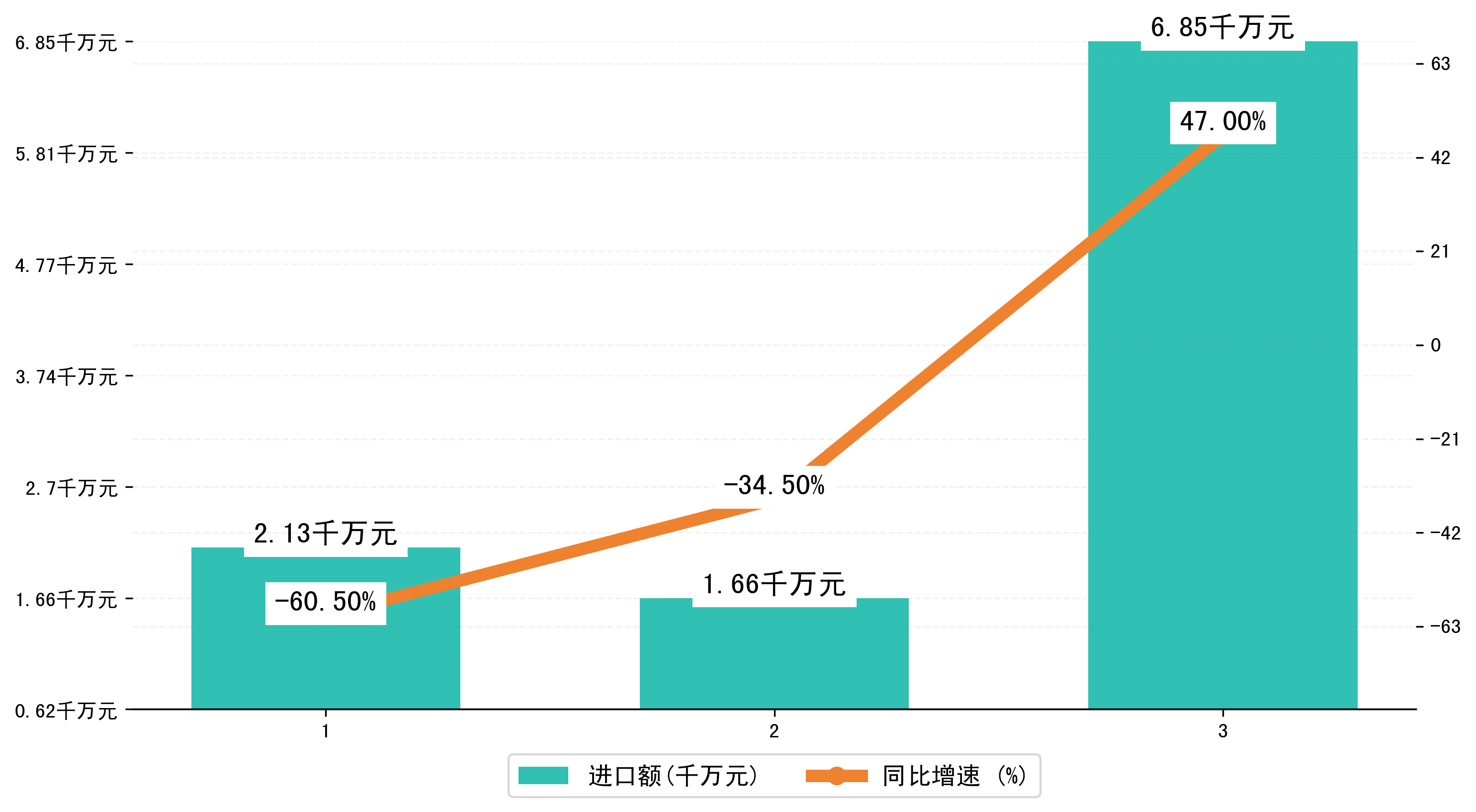 以人民币计,2025年3月景德镇市进口额为6851.0347万元,相比上月增加了5191.4726万元;相比上年同期增加了5397.2316万元,同比增加了47.00%。