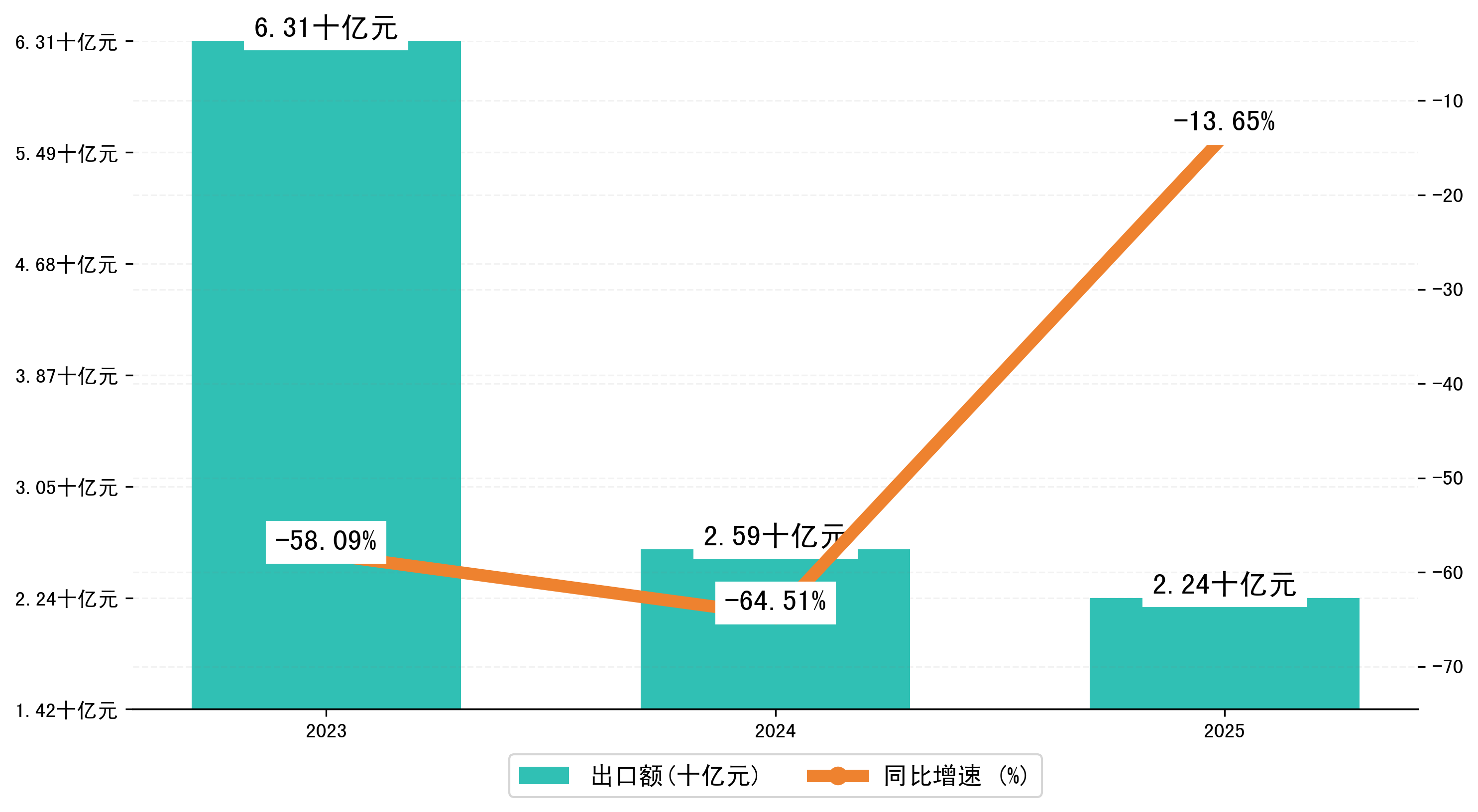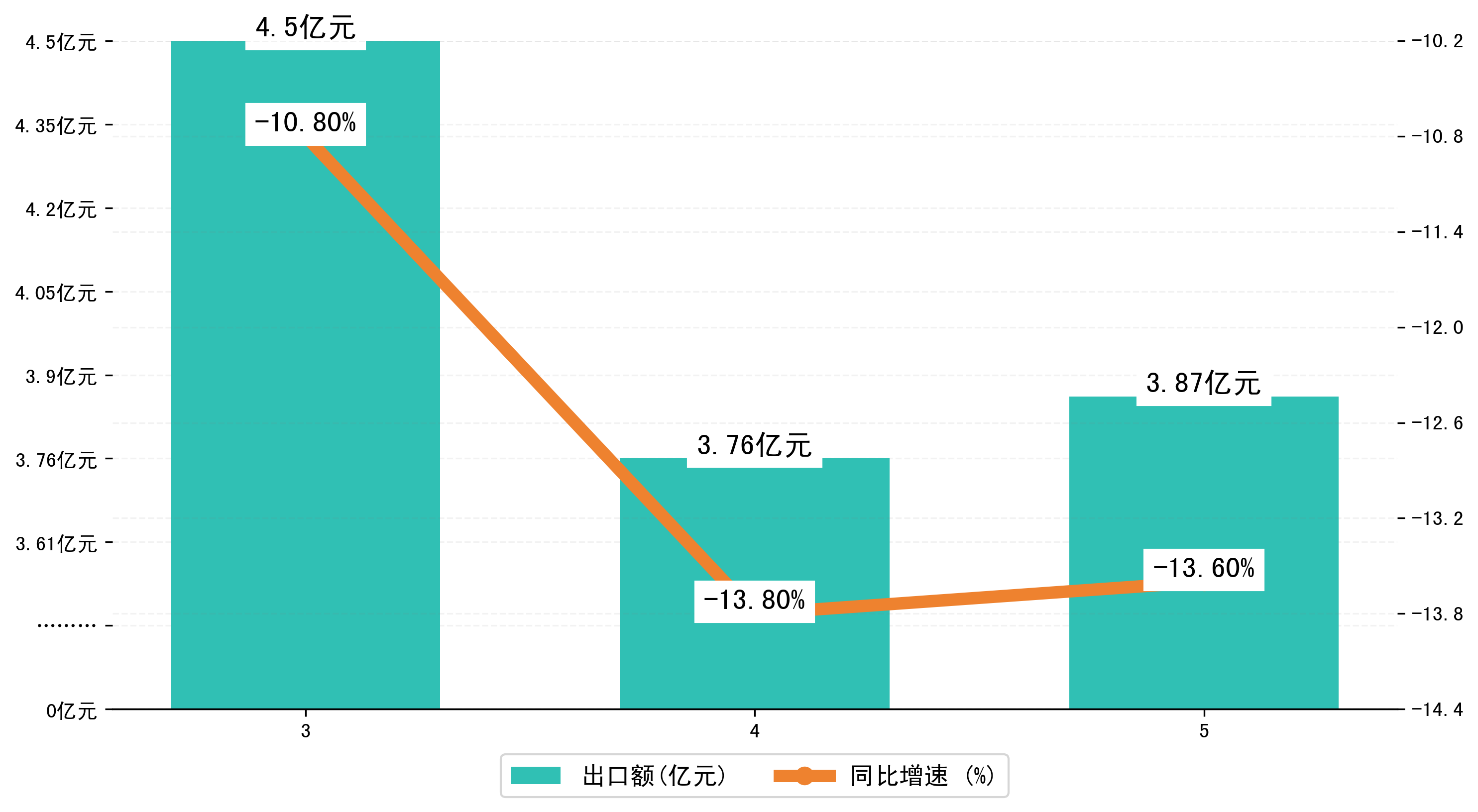 以美元计,2025年1-5月景德镇市出口额为3,1146.883万美元,相比上年同期减少了5339.3655万美元,同比减少-14.60%。