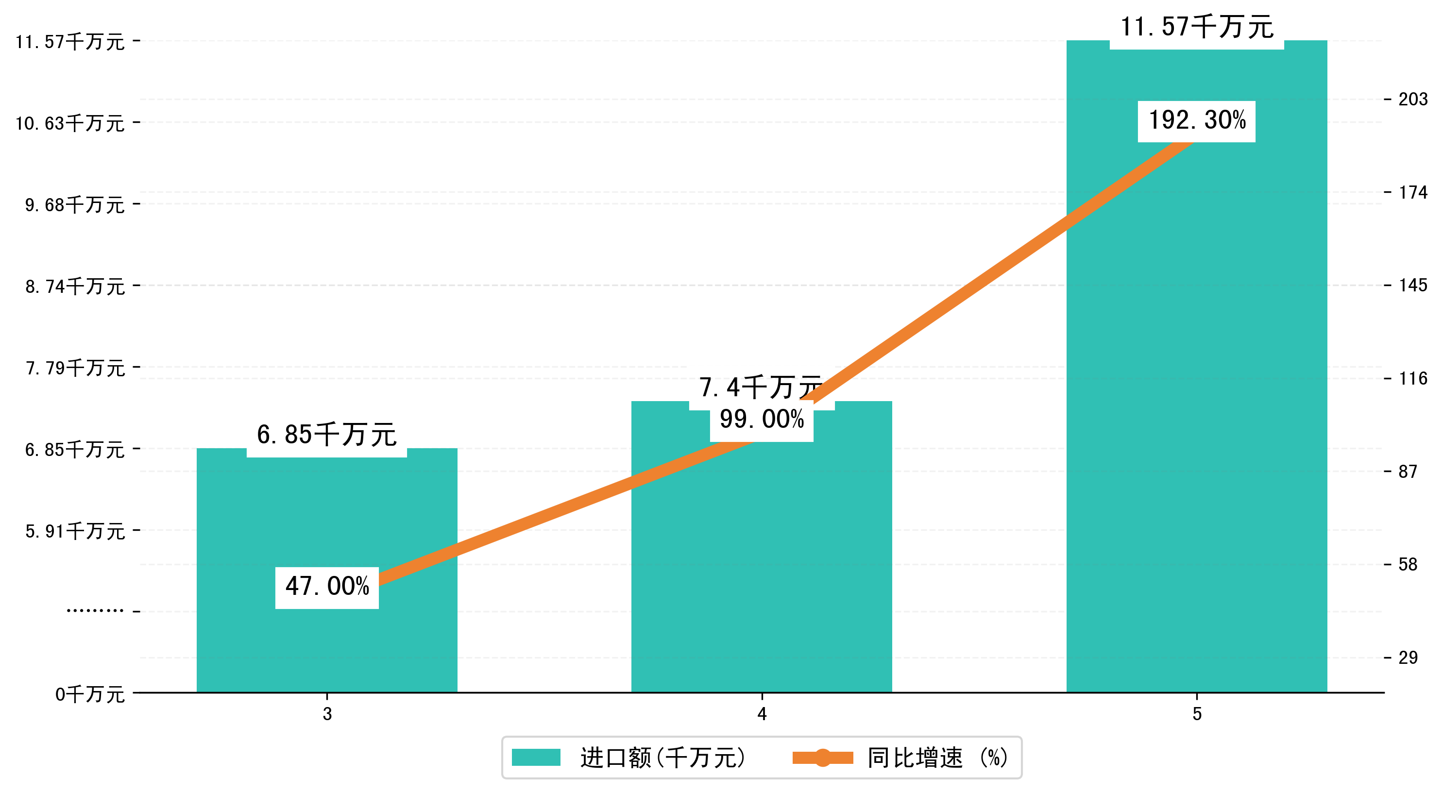 以人民币计,2025年5月景德镇市进口额为1,1568.7965万元,相比上月增加了4173.1872万元;相比上年同期增加了1,0502.5976万元,同比增加了192.30%。
