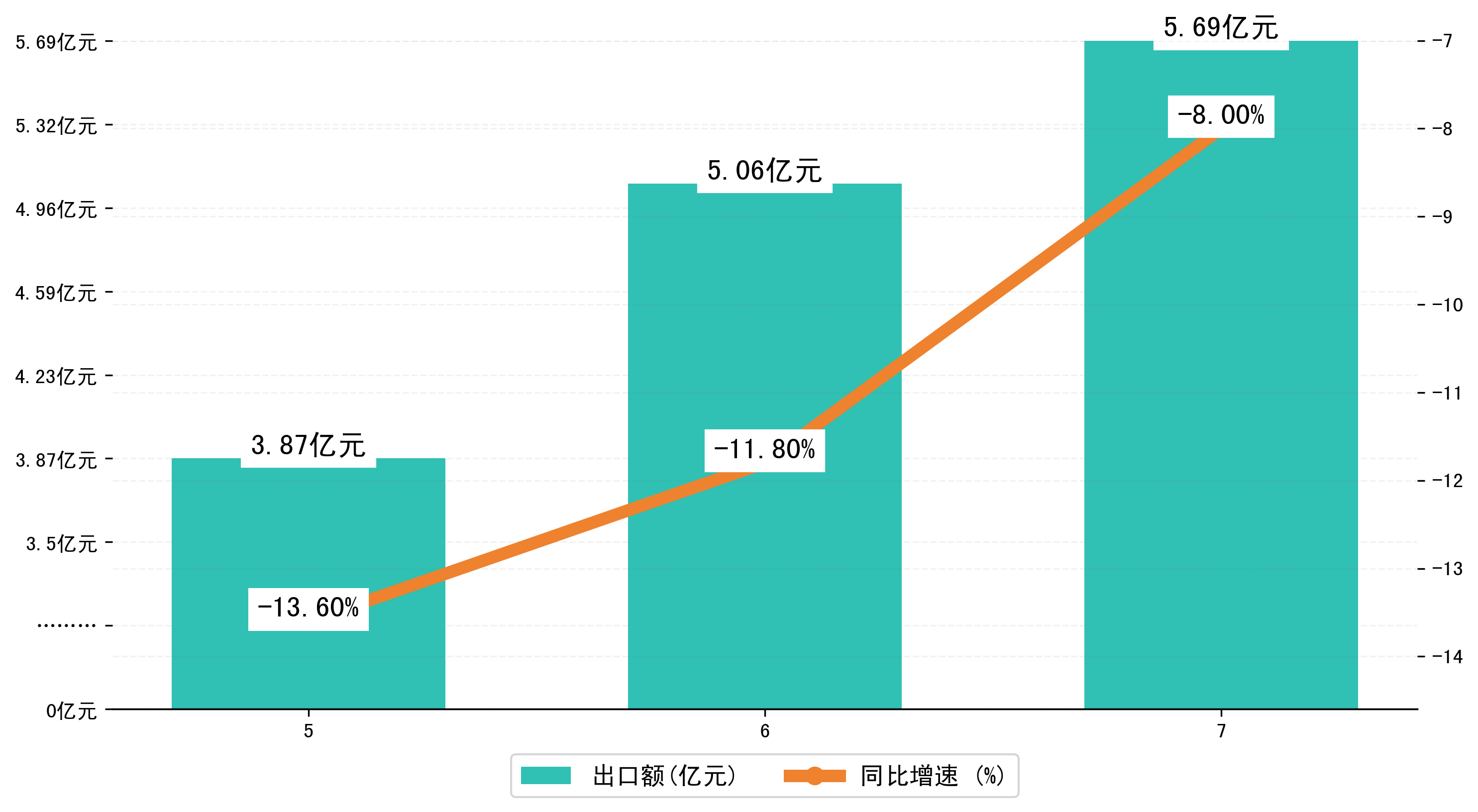 以美元计,2025年1-7月景德镇市出口额为4,6114.6215万美元,相比上年同期减少了4539.1258万美元,同比减少-9.00%。