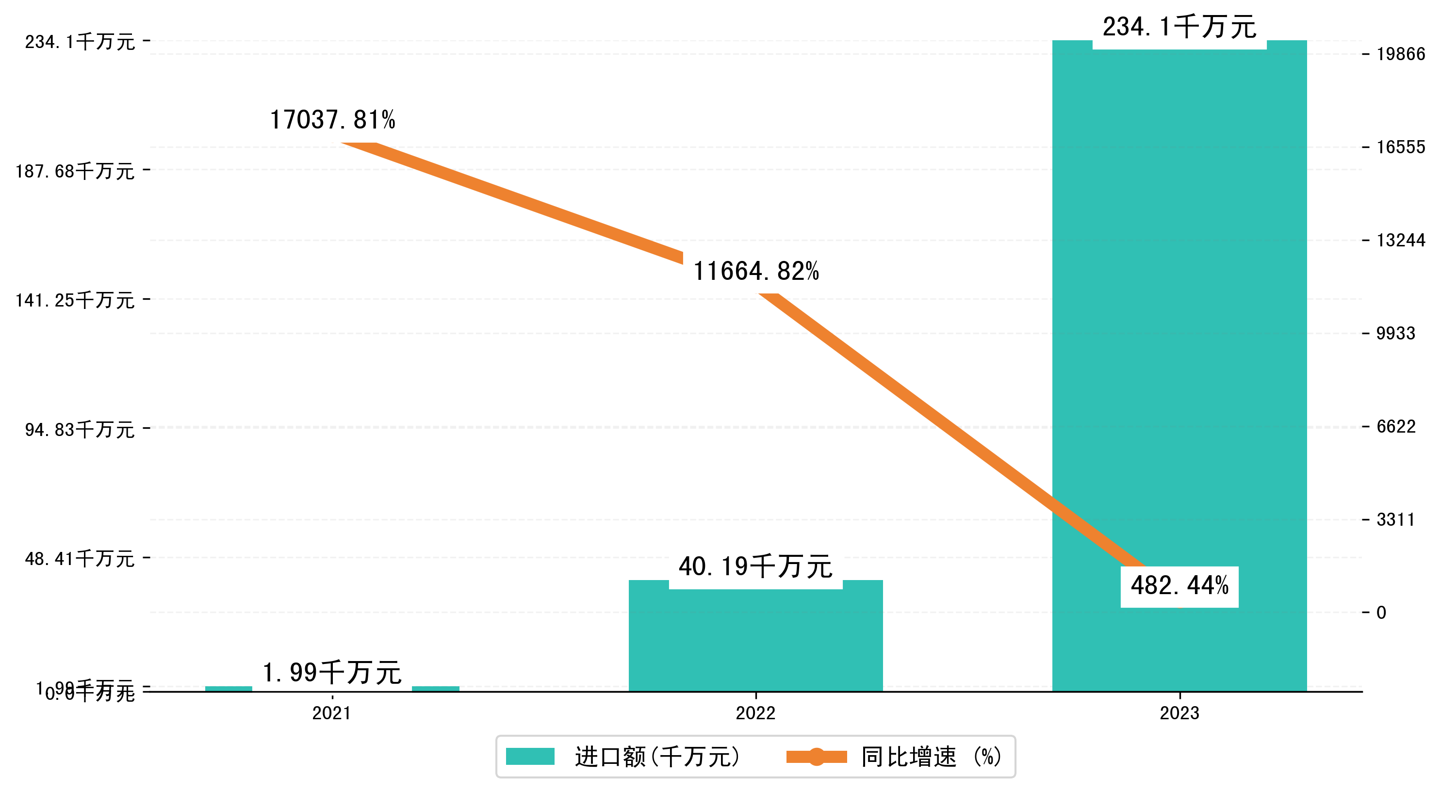 以美元计,2023年1-3月景德镇市进口额为3,4014.4878万美元,相比上年同期增加了2,7708.1672万美元,同比增加439.40%。
