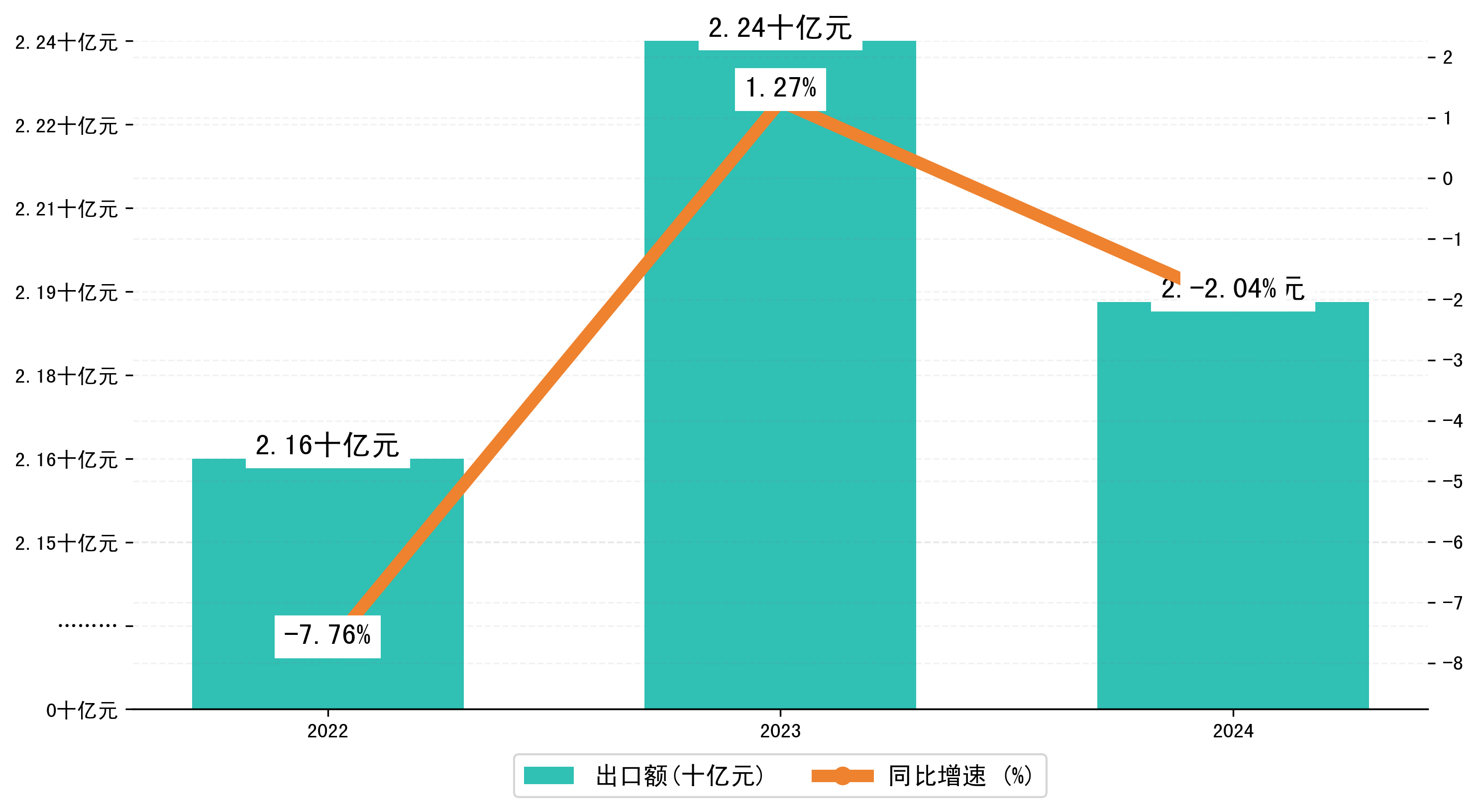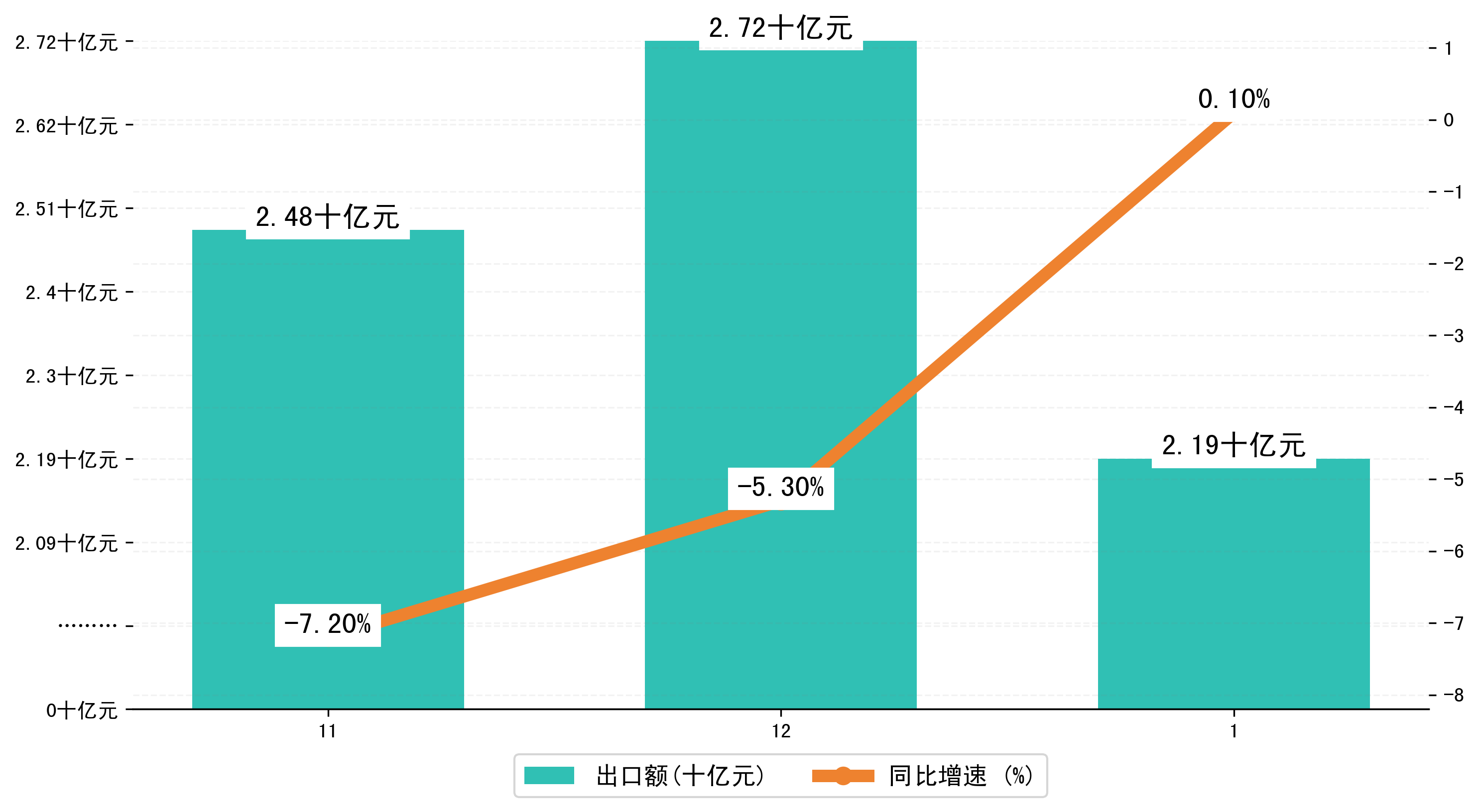 以人民币计,2024年1月荆州市出口额为21,9164.5287万元,相比上月减少了5,3011.5959万元;相比上年同期减少了4570.6418万元,同比增加了0.10%。